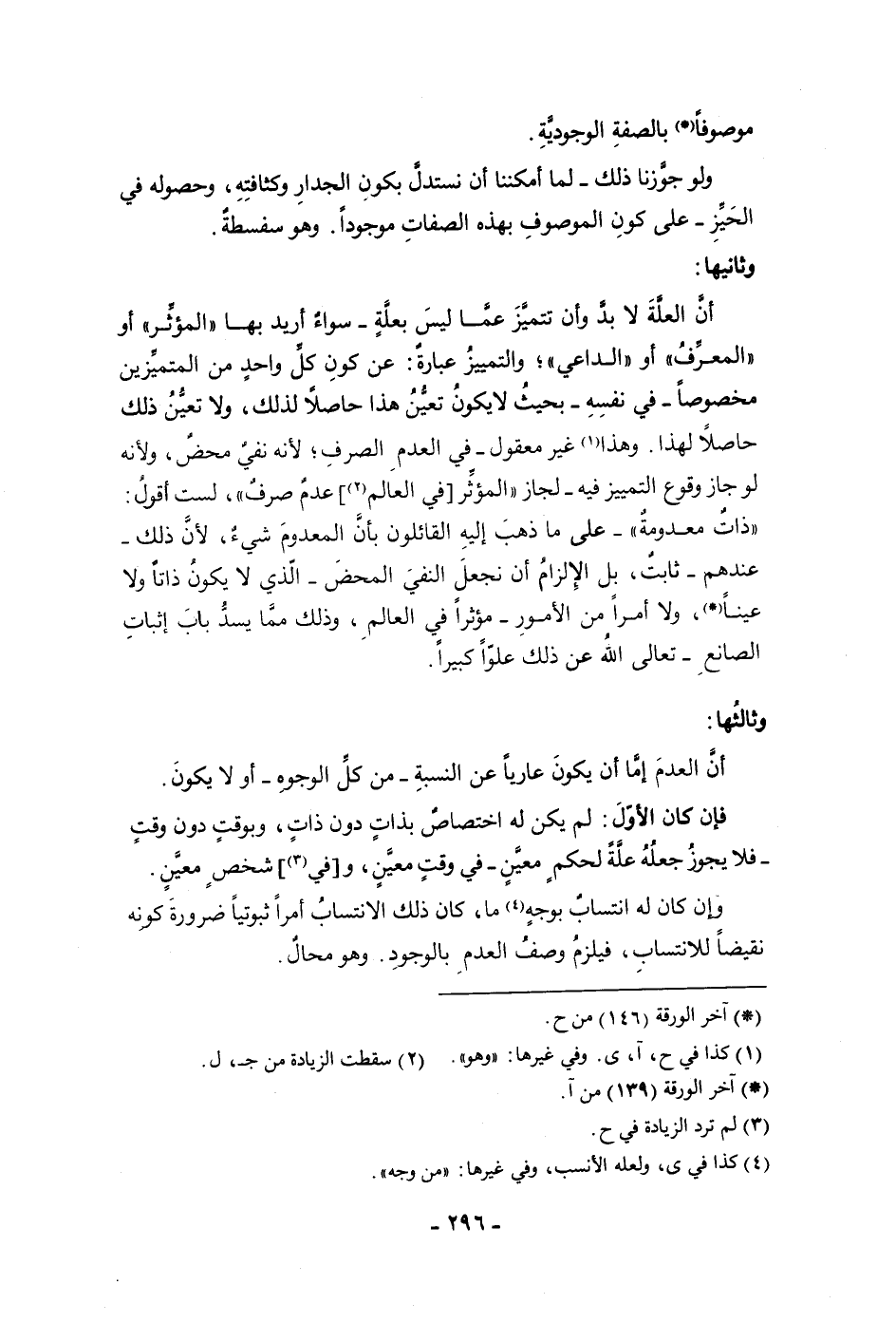 موصوفا بالصفة الوجودية ولو جوزنا ذلك لما أمكننا أن نستدل بكون الجدار وكثافته وحصوله في الحيز على كون الموصوف بهذه الصفات موجودا وهو سفسطة وثانيها أن العلة لابد وأن تتميز عما ليس بعلة سواء أريد بها المؤثر أو المعرف أو الداعي والتمييز عبارة عن كون كل واحد من المتميزين مخصوصا في نفسه بحيث لا يكون تعين هذا حاصلا لذلك ولا تعين ذلك