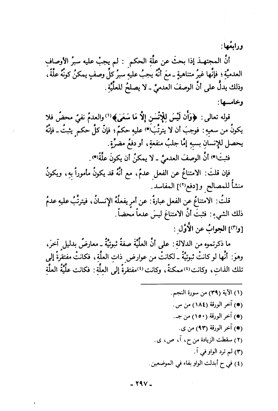 ورابعها أن المجتهد إذا بحث عن علة الحكم لم يجب عليه سبر الأوصاف العدمية فإنها غير متناهية مع أنه يجب عليه سبر كل وصف يمكن كونه علة وذلك يدل على أن الوصف العدمى لا يصلح للعلية وخامسها قوله تعالى وأن ليس للإنسان إلا ما سعى والعدم نفي محض فلا يكون من سعيه فوجب أن لا يترتب عليه حكم فإن كل حكم يثبت فإنه يحصل للإنسان بسببه إما جلب منفعة أو دفع مضرة فثبت أن الوصف العدمى لا يمكن أن يكون علة