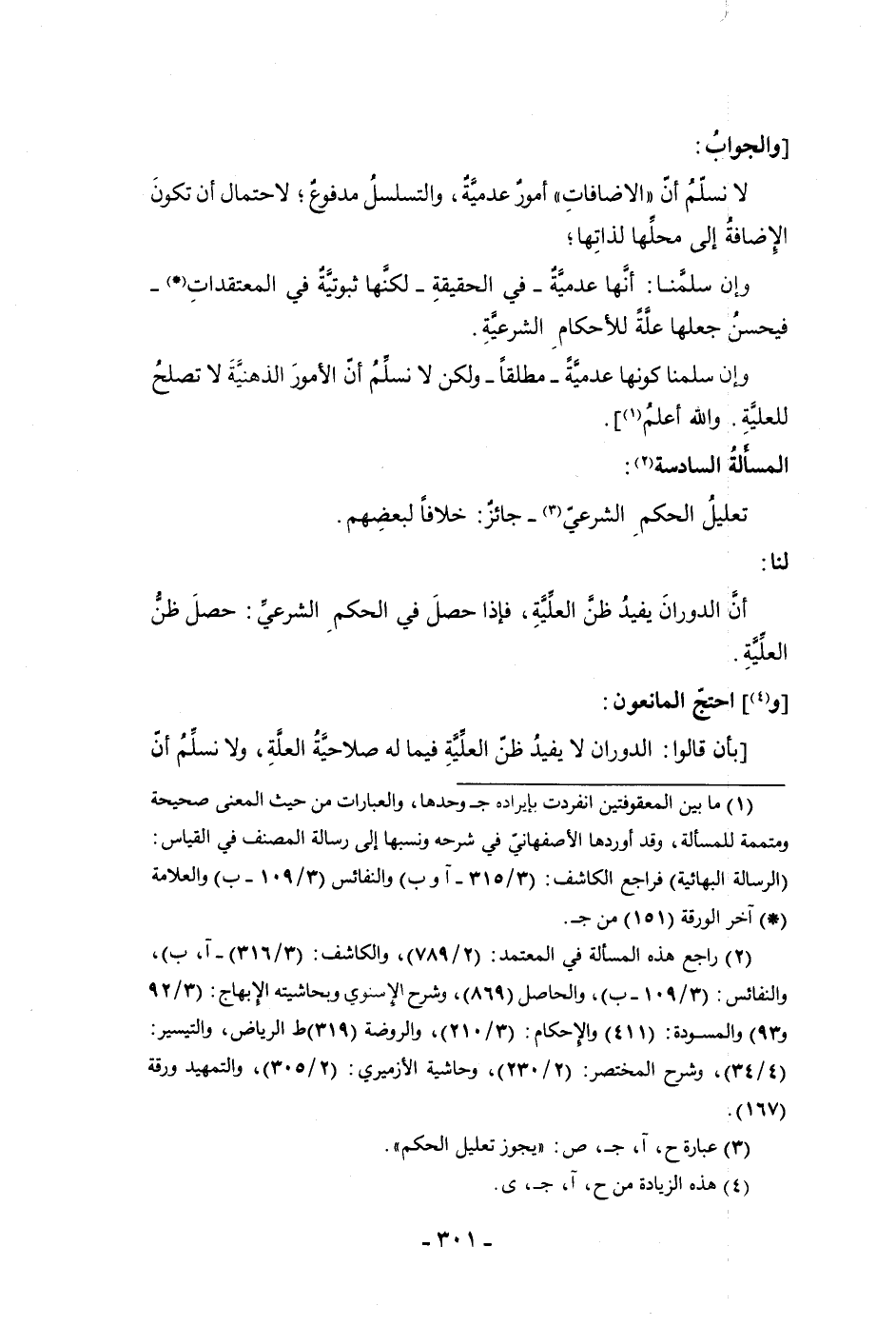 والجواب لا نسلم أن الإضافات أمور عدمية والتسلسل مدفوع لاحتمال أن تكون الإضافة إلى محلها لذاتها وأن سلمنا أنها عدمية في الحقيقة لكنها ثبوتية في المعتقدات فيحسن جعلها علة للأحكام الشرعية وإن سلمنا كونه عدمية مطلقا ولكن لا نسلم أن الأمور الذهنية لا تصلح للعلية والله أعلم