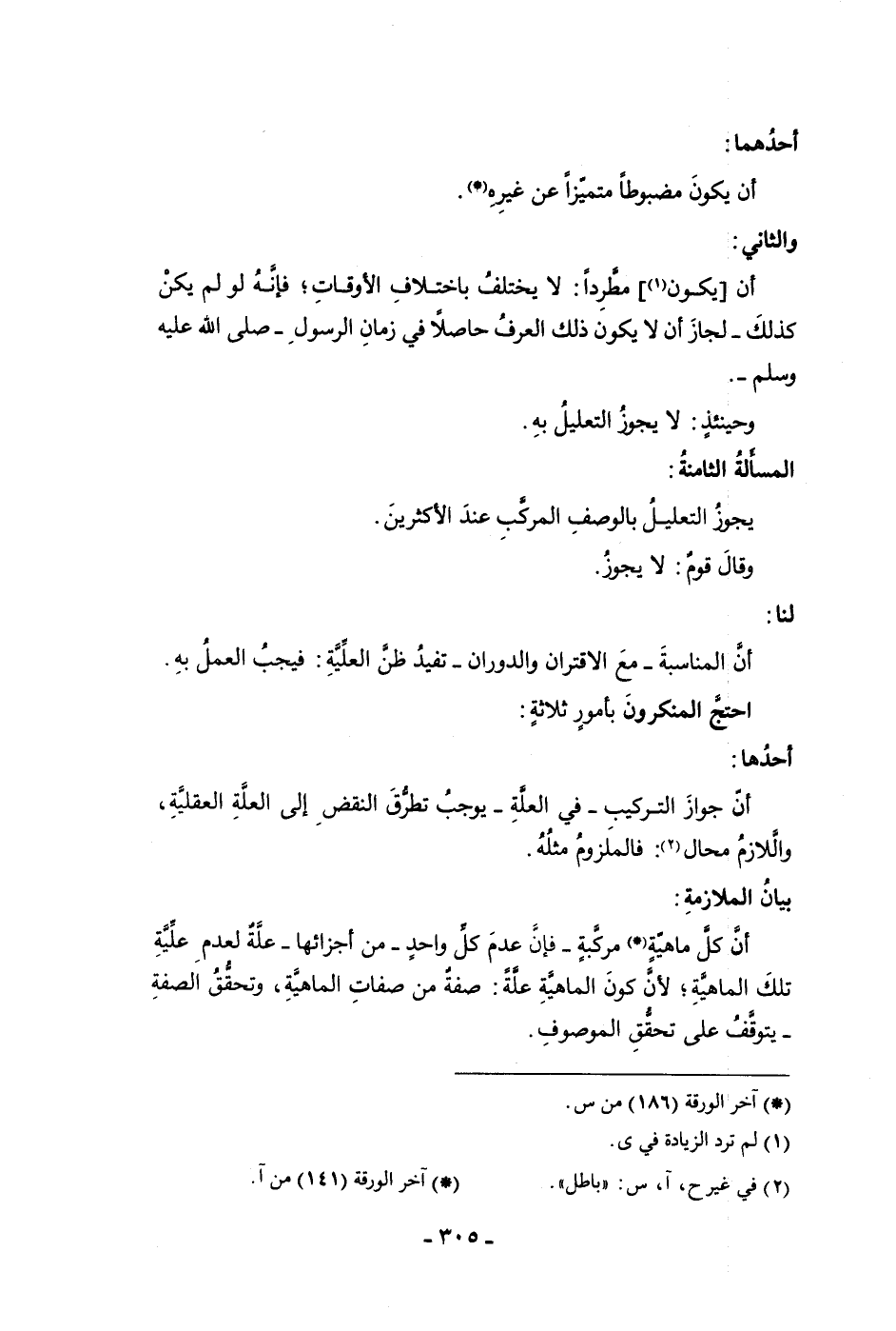 والثاني أن يكون مطردا لا يختلف باختلاف الأوقات فإنه لو لم يكن كذلك لجاز أن لا يكون ذلك العرف حاصلا في زمان الرسول ص وحينئذ لا يجوز التعليل به المسألة الثامنة يجوز التعليل بالوصف المركب عند الأكثرين وقال قوم لا يجوز لنا أن المناسبة مع الاقتران والدوران تفيد ظن العلية فيجب العمل به احتج المنكرون بأمور ثلاثة أحدها أن جواز التركيب في العلة يوجب تطرق النقض إلى العلة العقلية واللازم محال فالملزوم مثله بيان الملازمة أن كل ماهية مركبة فان عدم كل واحد من أجزائها علة لعدم علية تلك الماهية لأن كون الماهية علة صفة من صفات الماهية وتحقق الصفة يتوقف على تحقق الموصوف