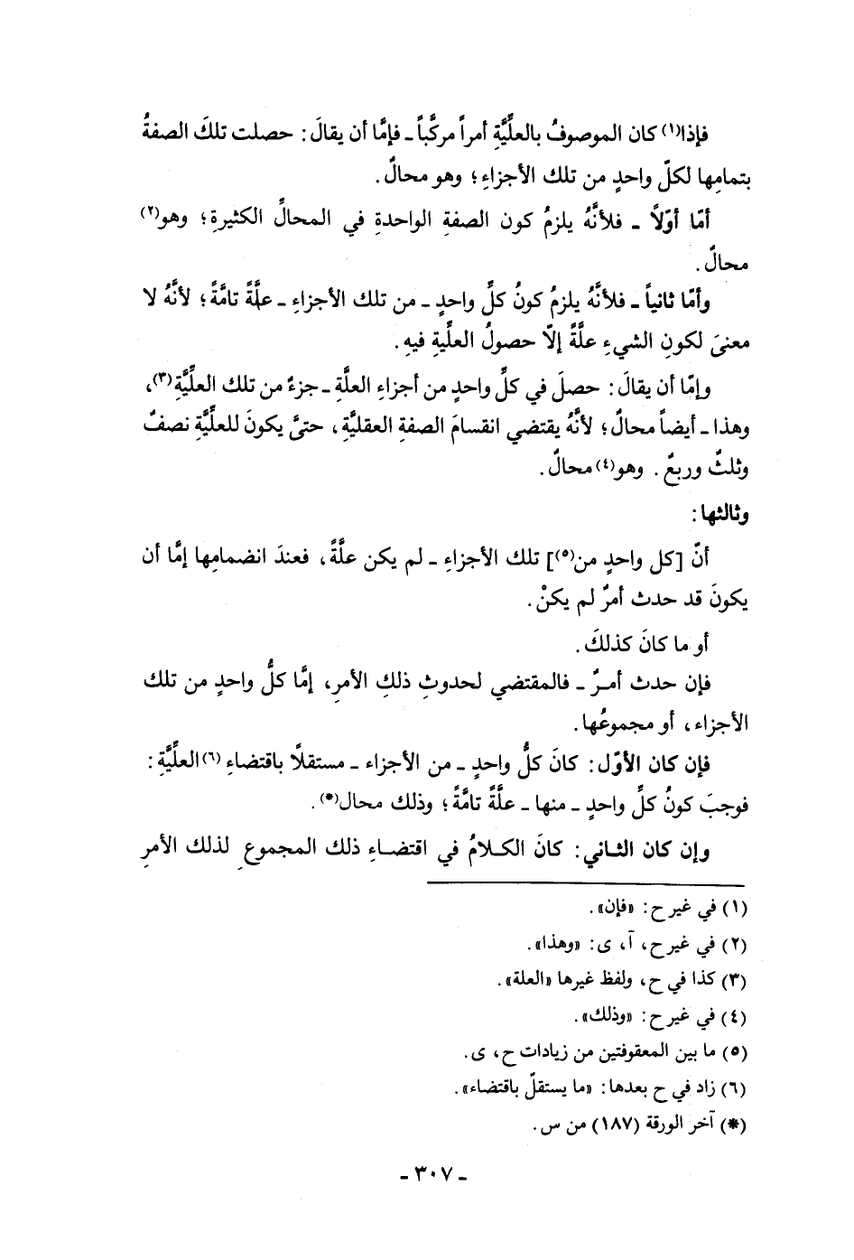 فإذا كان الموصوف بالعلية أمرا مركبا فإما أن يقال حصلت تلك الصفة بتمامها لكل واحد من تلك الأجزاء وهو محال أما أولا فلأنه يلزم الصفة الواحدة في المحال الكثيرة وهو محال وأما ثانيا فلأنه يلزم كون كل واحد من تلك الأجزاء علة تامة لأنه لا معنى لكون الشئ علة إلا حصول العلية فيه وإما أن يقال حصل في كل واحد من أجزاء العلة جزء من تلك العلية وهذا أيضا محال لأنه يقتضي انقسام الصفة العقلية حتى يكون للعلية نصف