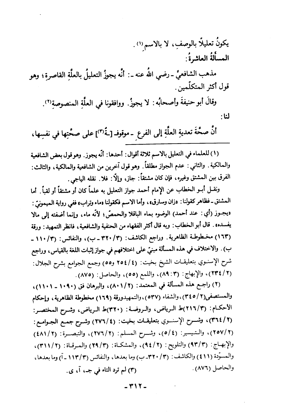 يكون تعليلا بالوصف لا بالاسم المسألة العاشرة مذهب الشافعي رضي الله عنه أن يجوز التعليل بالعلة القاصرة وهو قول أكثر المتكلمين وقال أبو حنيفة وأصحابه لا يجوز ووافقونا في العلة المنصوصة لنا أن صحة تعدية العلة إلى الفرع موقوفة على صحتها في نفسها