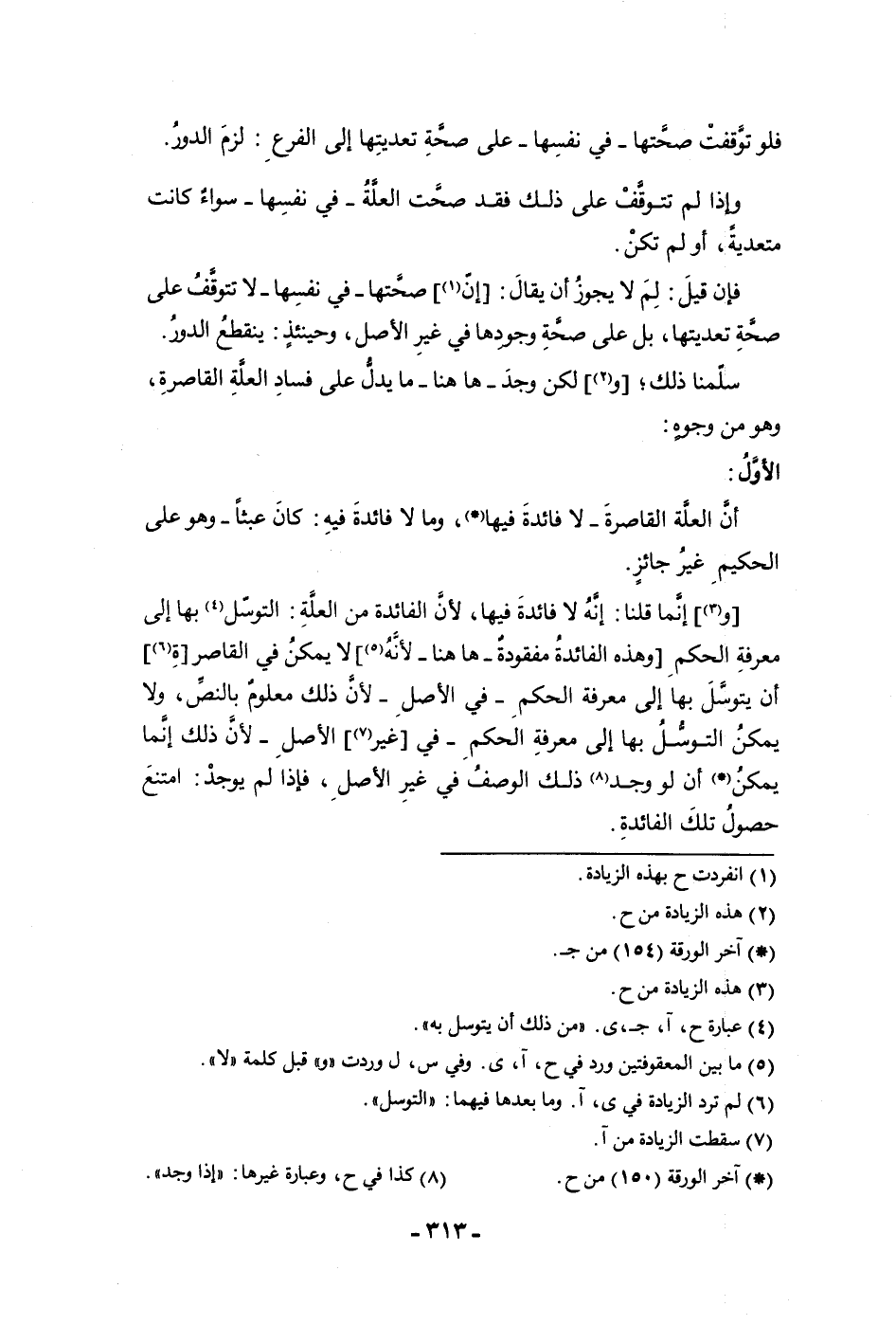 فلو توقفت صحتها في نفسها على صحة تعديتها إلى الفرع لزم الدور وإذا لم تتوقف على ذلك فقد صحت العلة في نفسها سواء كانت متعدية أو لم تكن فإن قيل لم لا يجوز أن يقال إن صحتها في نفسها لا تتوقف على صحة تعديتها بل على صحة وجودها في غير الأصل وحينئذ ينقطع الدور سلمنا ذلك ولكن وجد هاهنا ما يدل على فساد العلة القاصرة وهو من وجوه الأول أن العلة القاصرة لا فائدة فيها وما لا فائدة فيه كان عبثا وهو على