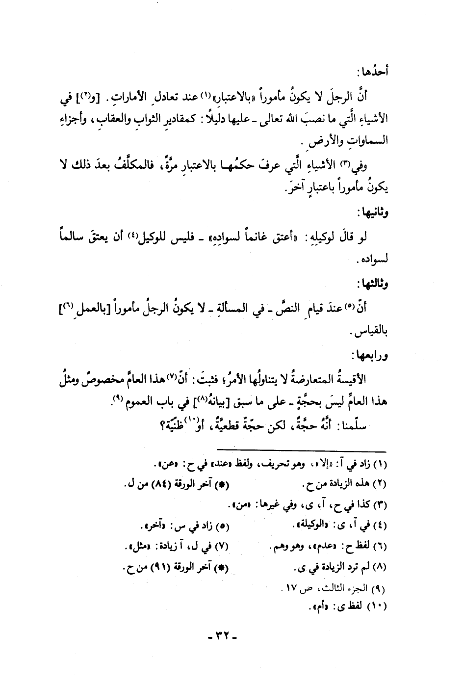 أحدهما أن الرجل لا يكون مأمورا بالاعتبار عند تعادل الأمارات وفي الأشياء التي ما نصب الله تعالى عليها دليلا كمقادير الثواب والعقاب وأجزاء السماوات والأرض وفي الأشياء التي عرف حكمها بالاعتبار مرة فالمكلف بعد ذلك لا يكون مأمورا بأعتبار آخر وثانيها لو قال لوكيله أعتق غانما لسواده فليس للوكيل أن يعتق سالما لسواده وثالثها أن عند قيام النص في المسألة لا يكون الرجل مأمورا بالعمل بالقياس ورابعها الأقيسة المتعارضة لا يتناولها الأمر فثبت أن هذا العام مخصوص ومثل هذا العام ليس بحجة على ما سبق بيانه في باب العموم سلمنا أنه حجة لكن حجة قطعية أو ظنية