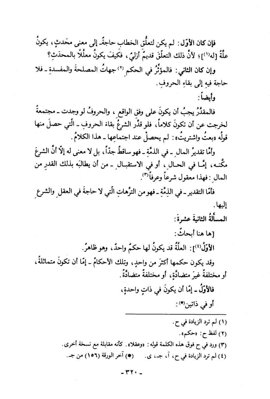 حاجة فيه إلى بقاء الحروف وأيضا فالمقدر يجب أن يكون على وفق الواقع والحروف لو وجدت مجتمعة لخرجت عن أن تكون كلاما فلو قدر الشرع بقاء الحروف التي حصل منها قوله بعت واشتريت لم يحصل عند اجتماعها هذا الكلام وأما تقدير المال في الذمة فهو ساقط جدا بل لا معنى له إلا أن الشرع مكنه إما في الحال أو في الاستقبال من أن يطالبه بذلك القدر من المال فهذا معقول شرعا وعرفا فأما التقدير في الذمة فهو من الترهات التي لا حاجة في العقل والشرع إليها المسألة الثانية عشر هاهنا أبحاث الأول العلة قد يكون لها حكم واحد وهو ظاهر وقد يكون حكمها أكثر من واحد وتلك الأحكام إما أن تكون متماثلة أو مختلفة غير متضادة أو مختلفة متضادة فالأول إما أن يكون في ذات واحدة أو في ذاتين