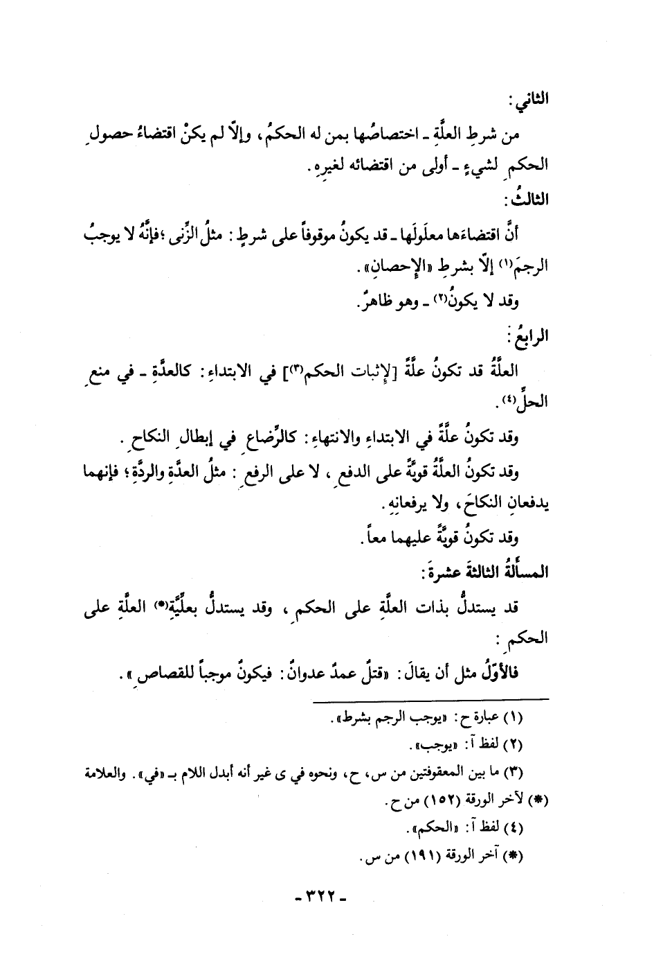 الثاني من شرط العلة اختصاصها بمن له الحكم وإلا لم يكن اقتضاء حصول الحكم لشئ أولى من اقتضائه لغيره الثالث أن اقتضاءها معلولها قد يكون موقوفا على شرط مثل الزنا فإنه لا يوجب الرجم إلا بشرط الإحصان وقد لا يكون وهو ظاهر الرابع