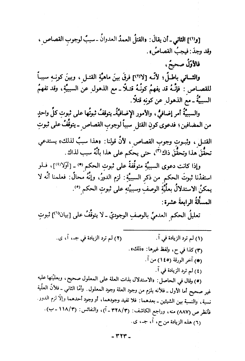 استفدنا ثبوت الحكم من ذكر السببية لزم الدور وإنه محال فعلمنا أنه لا يمكن الاستدلال بعلية الوصف وسببيته على ثبوت الحكم المسألة الرابعة عشر تعليل الحكم العدمي بالوصف الوجودى لا يتوقف على بيان ثبوت