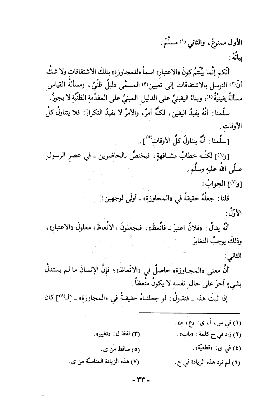سلنا أنه يفيد اليقين لكنه أمر والأمر لا يفيد التكرار فلا يتناول كل الأوقات سلمنا أنه يتناول كل الأوقات ولكنه خطاب مشافهة فيختص بالحاضرين في عصر الرسول ص والجواب قلنا جعله حقيقة في المجاوزة أولى لوجهين الأول أنه يقال فلان اعتبر فأتعظ فيجعلون الاتعاظ معلول الاعتبار وذلك يوجب التغاير الثاني أن معنى المجاوزة حاصل في الاتعاظ فإن الإنسان ما لم يستدل بشئ آخر على حال نفسه لا يكون متعظا إذا ثبت هذا فنقول لو جعلناه حقيقة في المجاوزة لكان