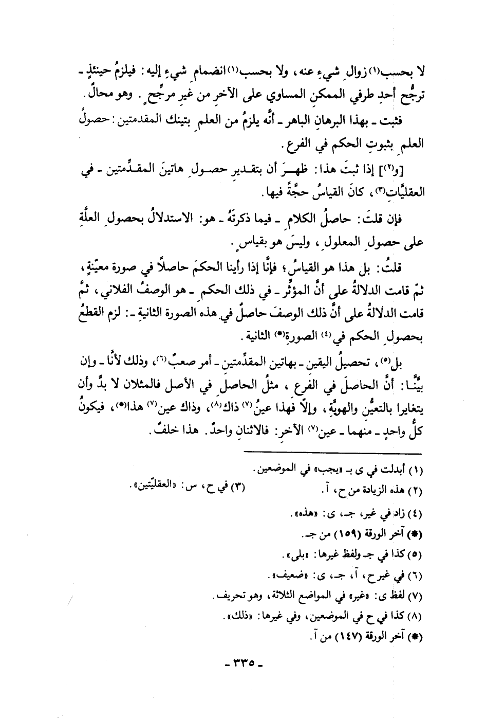 لا بحسب زوال شئ عنه ولا بحسب انضمام شئ إليه فيلزم حينئذ ترجح أحد طرفي الممكن المساوي على الآخر من غير مرجح وهو محال فثبت بهذا البرهان الباهر أنه يلزم من العلم بتينك المقدمين حصول العلم بثبوت الحكم في الفرع وإذا ثبت هذا ظهر أن بتقدير حصول هاتين المقدمتين في العقليات كان القياس حجة فيها فإن قلت حاصل الكلام فيما ذكرته هو الاستدلال بحصول العلة على حصول المعلول وليس هو بقياس قلت بل هذا هو القياس فإنا إذا رأينا الحكم حاصلا في صورة معية ثم قامت الدلالة على أن المؤثر في ذلك الحكم هو الوصف الفلانى ثم قامت الدلالة على أن ذلك الوصف حاصل في هذه الصورة الثانية لزم القطع بحصول الحكم في الصورة الثانية بل تحصيل اليقين بهاتين المقدمتين أمر صعب وذلك لأنا وإن بينا أن الحاصل في الفرع مثل الحاصل في الأصل فالمثلان ولا لابد وأن يتغايرا بالتعين والهوية وإلا فهذا عين ذاك وذاك عين هذا فيكون كل واحد منهما عين الآخر فالاثنان واحد هذا خلف