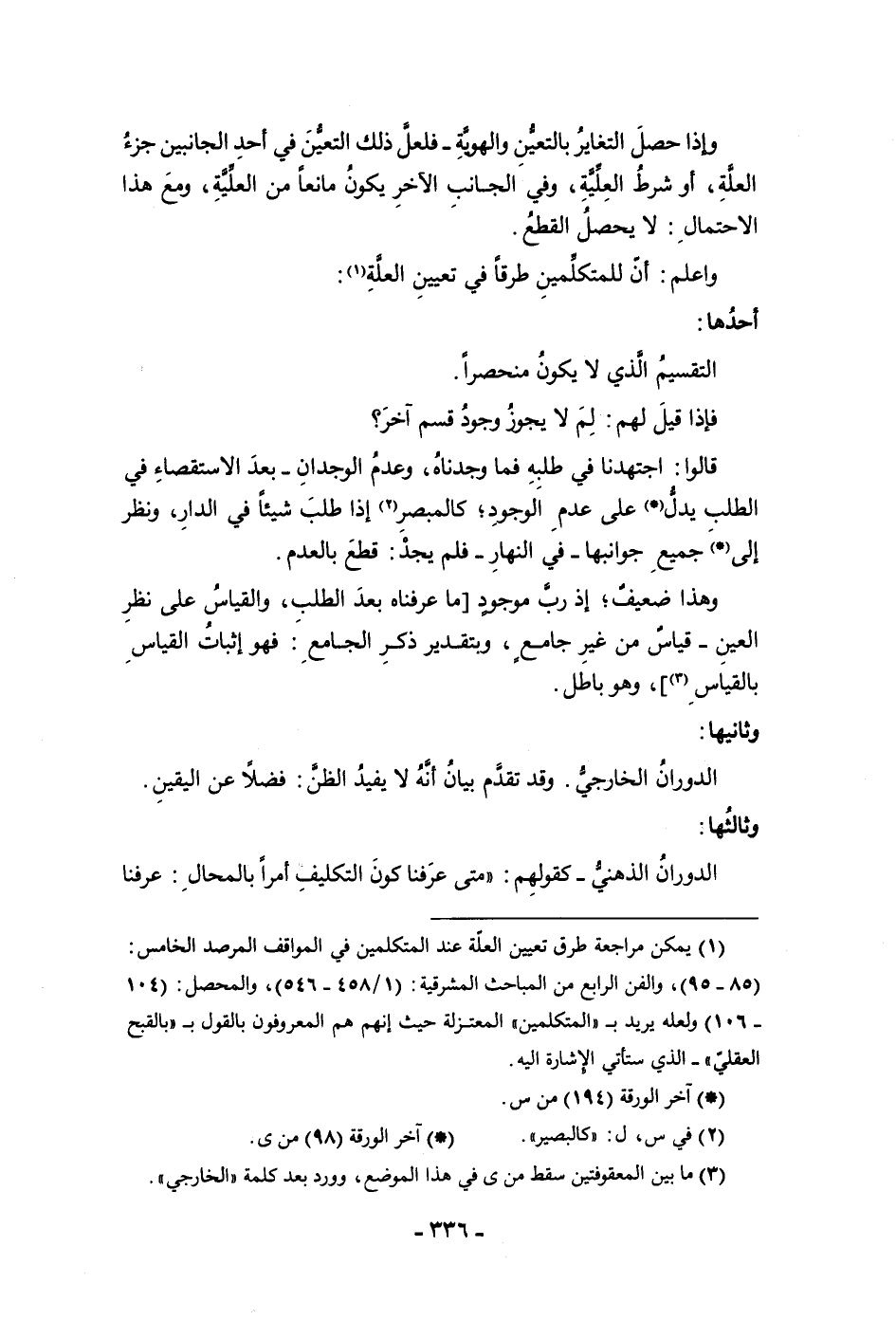 الاحتمال لا يحصل القطع وأعلم أن للمتكلمين طرقا في تعيين العلة أحدها التقسيم الذي لا يكون منحصرا فإذا قيل لهم لم لا يجوز وجود قسم آخر قالوا اجتهدنا في طلبه فما وجدناه وعدم الوجدان بعد الاستقصاء في الطلب يدل على عدم الوجود كالمبصر لم إذا طلب شيئا في الدار ونظر إلى جميع جوانبها في النهار فلم يجد قطع بالعدم وهذا ضعيف إذ رب موجود ما عرفناه بعد الطلب والقياس على نظر العين قياس من غير جامع وبتقدير ذكر الجامع فهو إثبات القياس بالقياس وهو باطل وثانيها الدوران الخارجى وقد تقدم بيان أنه لا يفيد الظن فضلا عن اليقين وثالثها الدوران الذهنى كقولهم متى عرفنا كون التكليف أمرا بالمحال عرفنا