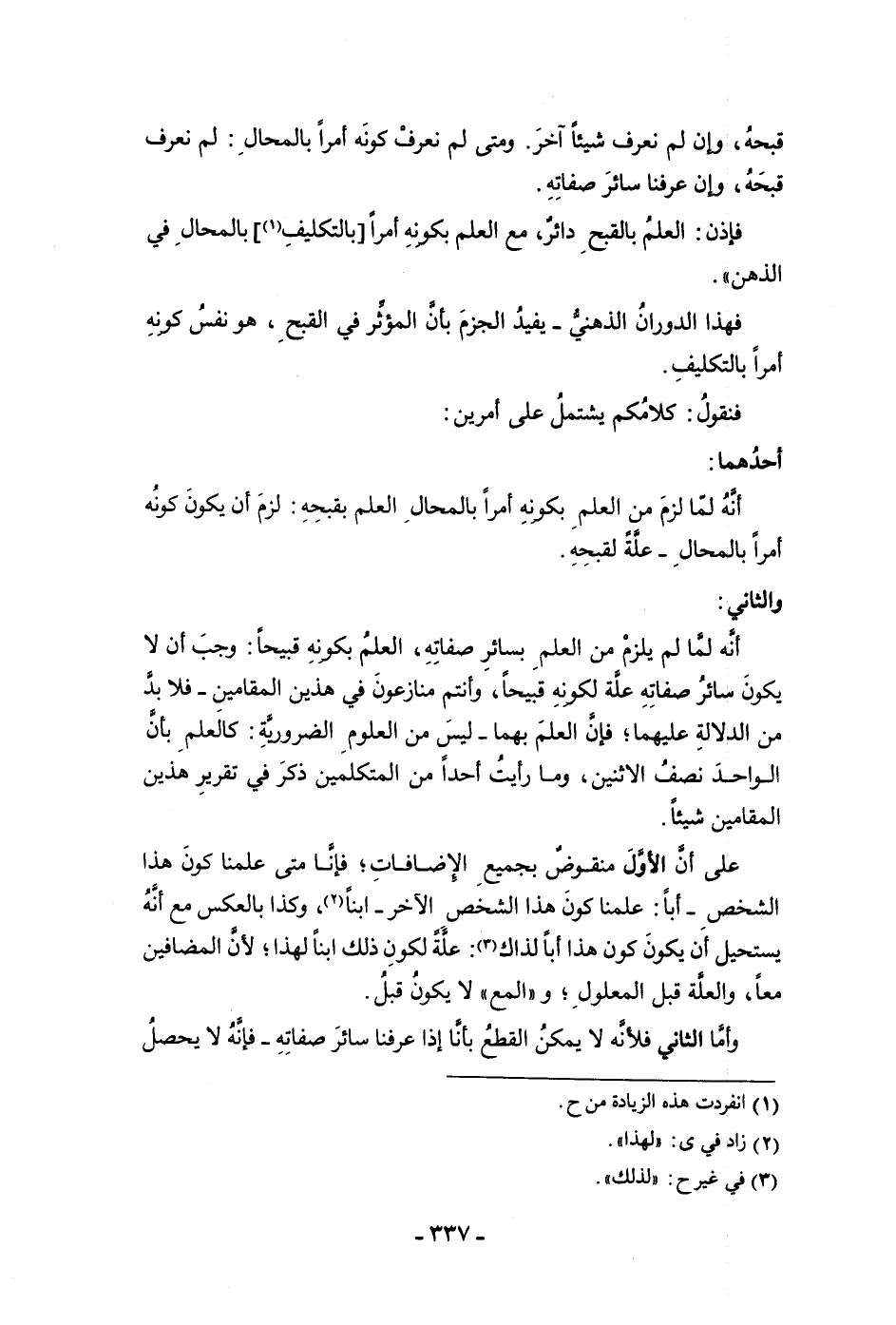 قبحه وإن لم نعرف شيئا آخر ومتى لم نعرف كونه أمرا بالمحال لم نعرف قبحه وإن عرفنا سائر صفاته فإذن العلم بالقبح دائر مع العلم بكونه أمرا بالتكليف بالمحال في الذهن فهذا الدوران الذهنى يفيد الجزم بأن المؤثر في القبح هو نفس كونه أمرا بالتكليف فنقول كلامكم يشتمل على أمرين أحدهما