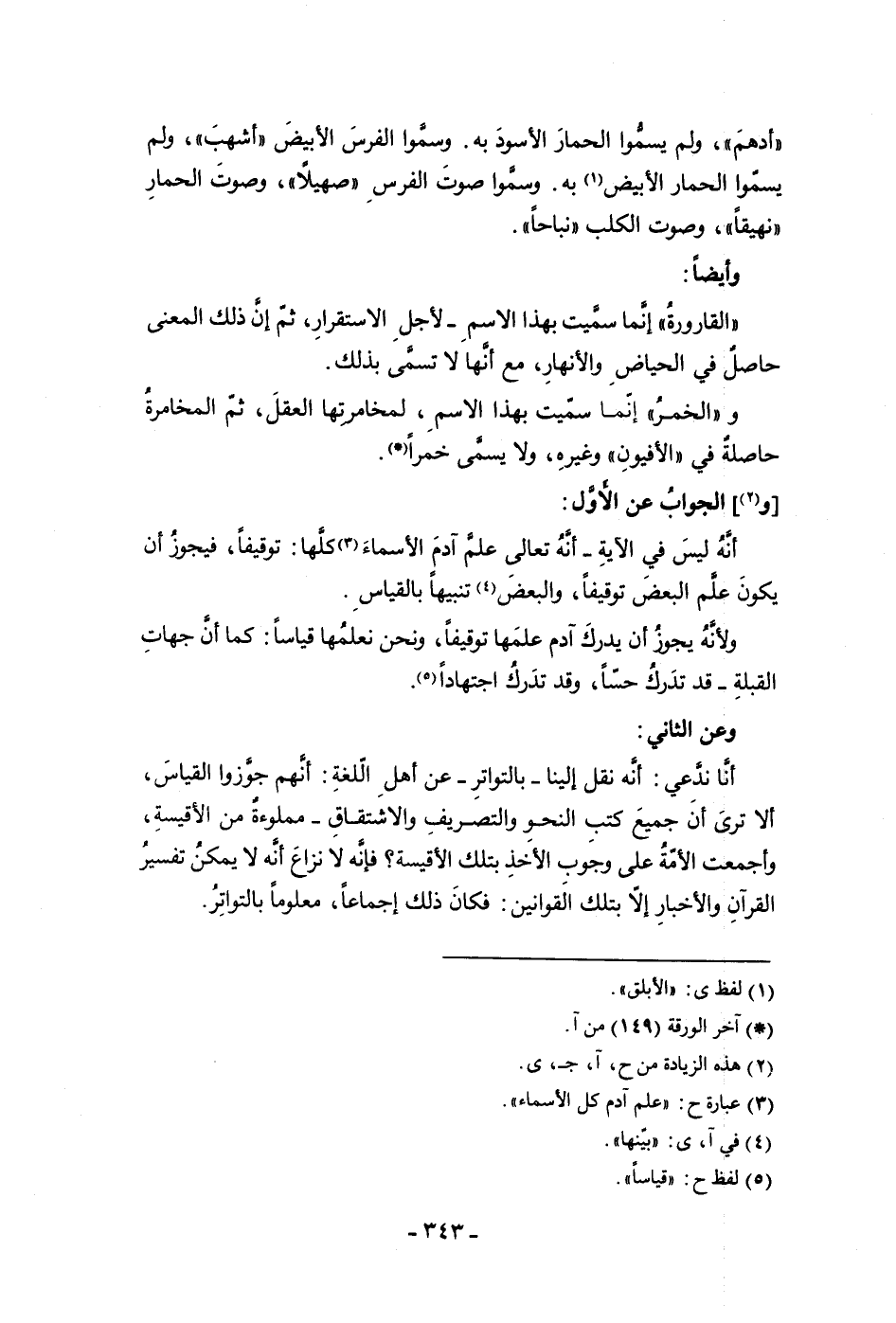 والجواب عن الأول أنه ليس في الآية أنه تعالى علم آدم الأسماء كلها توقيفا فيجوز أن يكون علم البعض توقيفا والبعض تنبيها بالقياس ولأنه يجوز أن يدرك آدم علمها توقيفا ونحن نعلمها قياسا كما أن جهات القبلة قد تدر ك حسا وقد تدرك اجتهادا وعن الثاني أنا ندعى أنه نقل إلينا بالتواتر عن أهل اللغة أنهم جوزوا القياس ألا ترى أن جميع كتب النحو والتصريف والاشتقاق مملوءة من الأقيسة وأجمعت الأمة على وجوب الأخذ بتلك الأقيسة فإنه لا نزاع إنه لا يمكن تفسير القرآن والأخبار إلا بتلك القوانين فكان ذلك إجماعا معلوما بالتواتر
