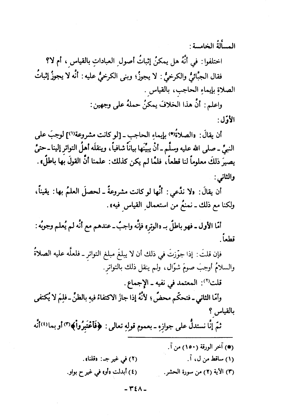 فقال الجبائى والكرخي لا يجوز وبنى الكرخي عليه إنه لا يجوز إثبات الصلاة بإيماء الحاجب بالقياس واعلم أن هذا الخلاف يمكن حمله على وجهين الأول أن يقال الصلاة بإيماء الحاجب لو كانت مشروعة لوجب على النبي ص أن يبينها بيانا شافيا وينقله أهل التواتر إلينا حتى يصير ذلك معلوما لنا قطعا فلما لم يكن كذلك علمنا أن القول بها باطل والثاني أن يقال لا ندعي أنها لو كانت مشروعة لحصل العلم بها يقينا ولكنا مع ذلك نمنع من استعمال القياس فيه أما الأول فهو باطل بالوتر فإنه واجب عندهم مع أنه لم يعلم وجوبه قطعا فإن قلت إذا جوزت في ذلك أن لا يبلغ مبلغ التواتر فلعله عليه الصلاة والسلام أوجب صوم شوال ولم ينقل ذلك بالتواتر قلت المعتمد في نفيه الإجماع وأما الثاني فتحكم محض لأنه إذا جاز الاكتفاء فيه بالظن فلم لا يكتفى بالقياس ثم إنا نستدل على جوازه بعموم قوله تعالى فاعتبروا أو بما أنه