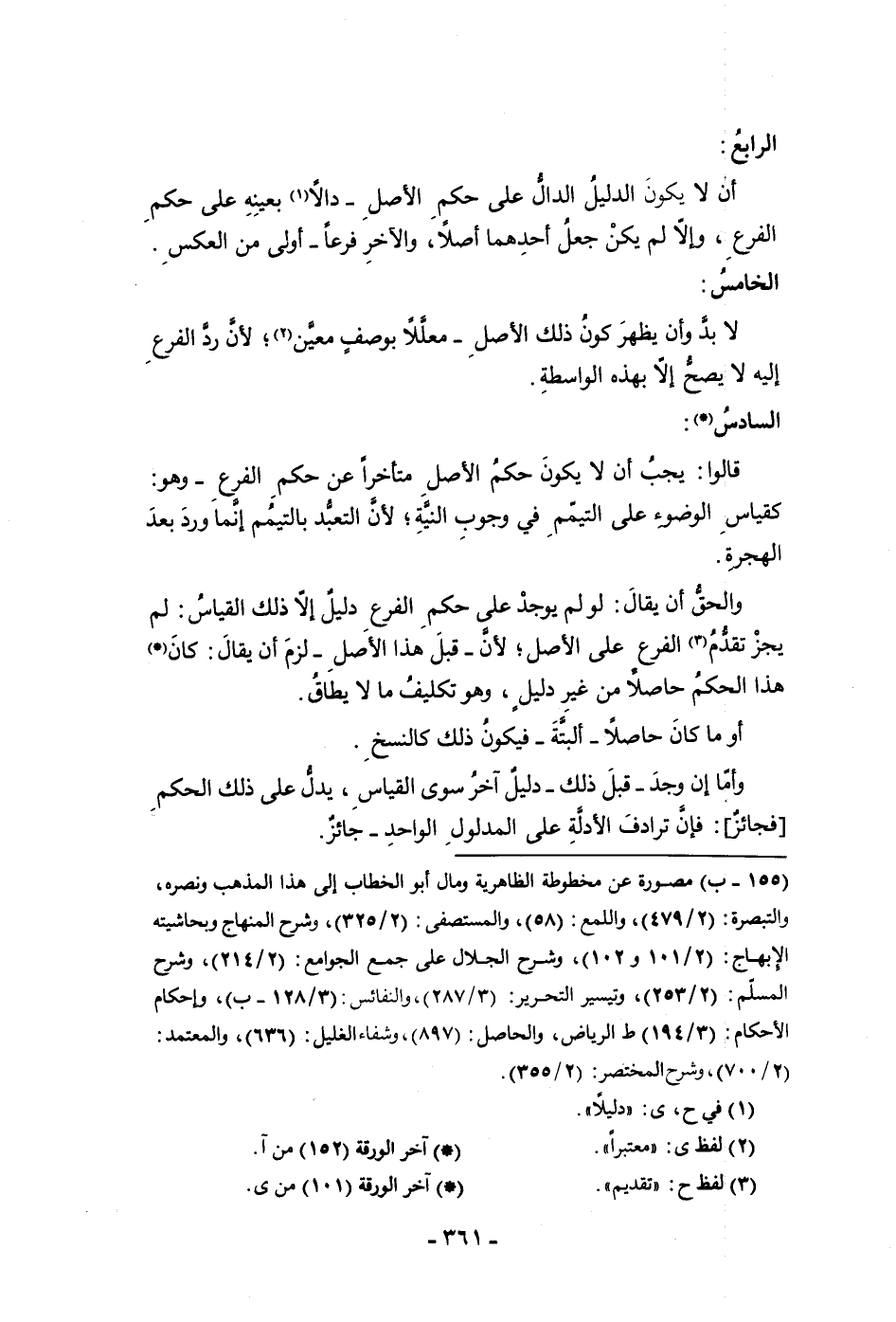 الرابع أن لا يكون الدليل الدال على حكم الأصل دالا بعينه على حكم الفرع وإلا لم يكن جعل أحدهما أصلا والآخر فرعا أولى من العكس الخامس لابد وأن يظهر كون ذلك الأصل معللا بوصف معين لأن رد الفرع إليه لا يصلح إلا بهذه الواسطة السادس قالوا يجب أن لا يكون حكم الأصل متأخرا عن حكم الفرع وهو كقياس الوضوء على التيمم في وجوب النية لأن التعبد بالتيمم إنما ورد بعد الهجرة والحق أن يقال لو لم يوجد على حكم الفرع دليل إلا ذلك القياس لم يجز تقدم الفرع على الأصل لأن قبل هذا الأصل لزم أن يقال كان هذا الحكم حاصلا من غير دليل وهو تكليف مالا يطاق
