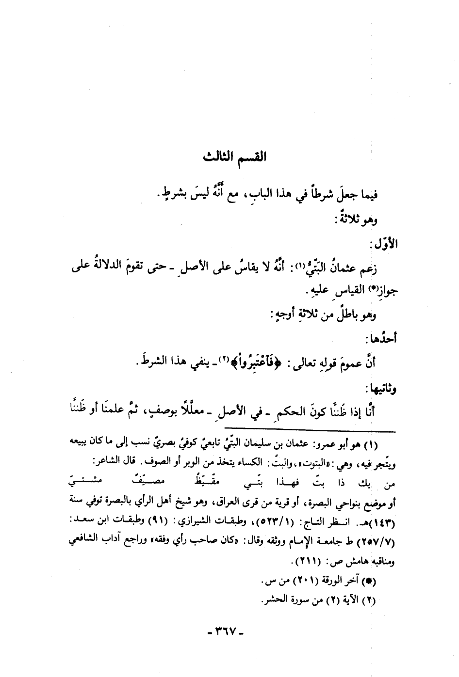 القسم الثالث فيما جعل شرطاً في هذا الباب مع أنه ليس بشرط وهو ثلاثة الأول زعم عثمان البتى أنه لا يقاس على الأصل حتى تقوم الدلالة على جواز القياس عليه وهو باطل من ثلاثة أوجه أحدها أن عموم قوله تعالى فاعتبروا ينفى هذا الشرط وثانيها أنا إذا ظننا كون الحكم في الأصل معللا بوصف ثم علمنا أو ظننا
