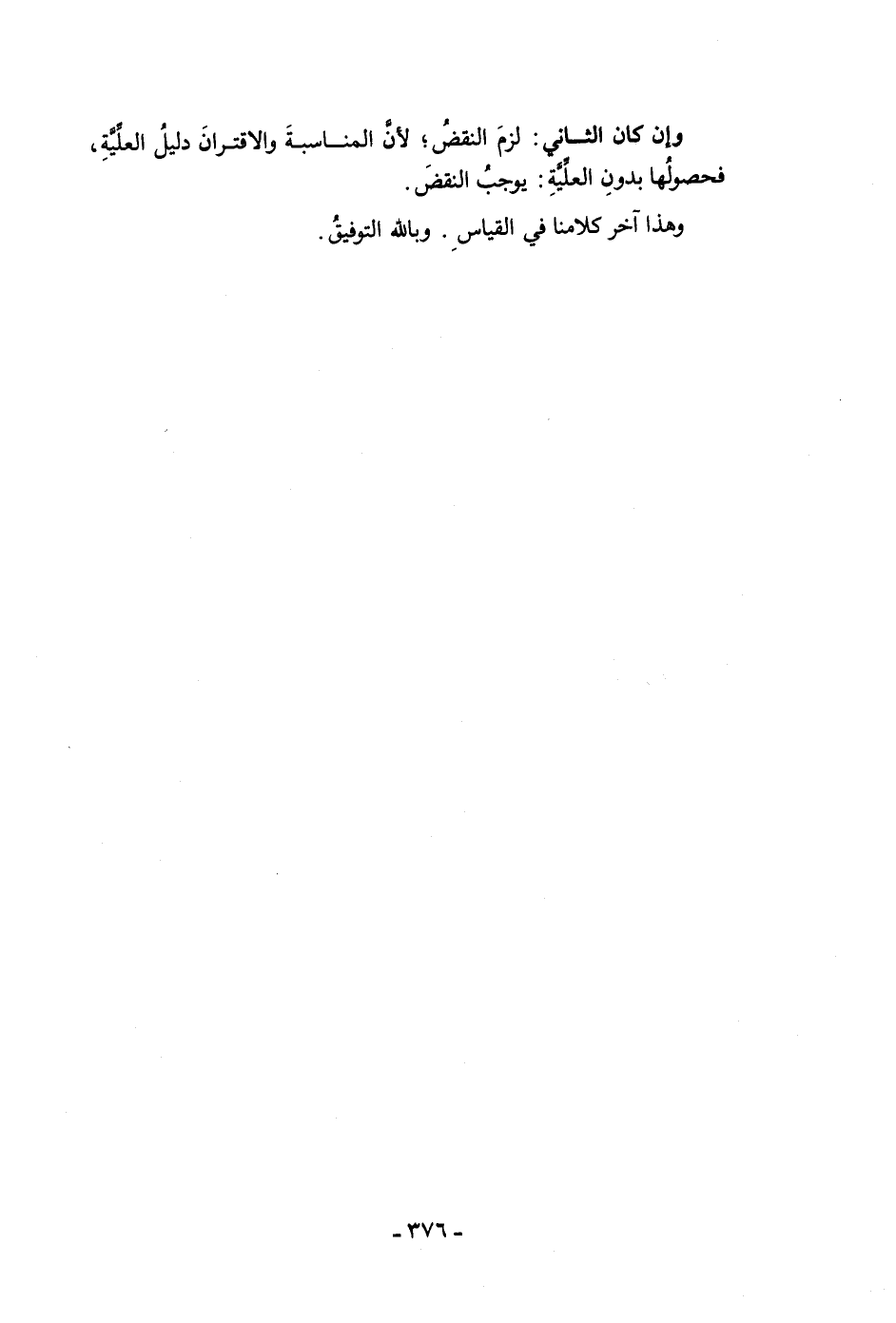 وإن كان الثاني لزم النقض لأن المناسبة والاقتران دليل العلية فحصولها بدون العلية يوجب النقض وهذا آخر كلامنا في القياس وبالله التوفيق