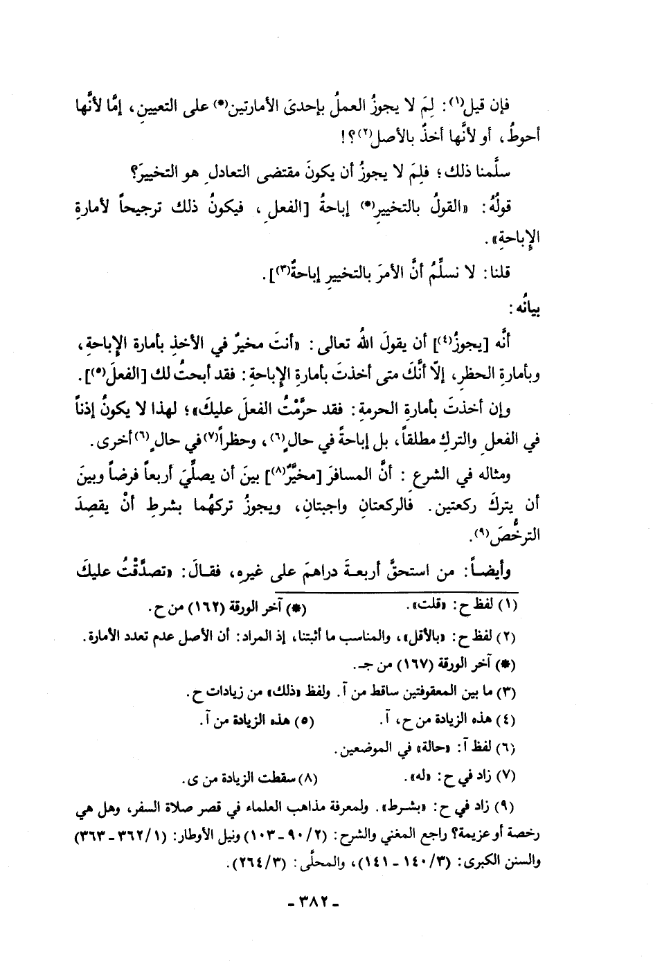 وإن أخذت بأمارة الحرمة فقد حرمت الفعل عليك فهذا لا يكون إذنا في الفعل والترك مطلقا بل إباحة في حال وحظرا في حال أخرى ومثاله في الشرع أن المسافر مخير بين أن يصلي أربعا فرضا وبين أن يترك ركعتين فالركعتان واجبتان ويجوز تركهما بشرط أن يقصد الترخص وأيضا من استحق أربعة دراهم على غيره فقال تصدقت عليك