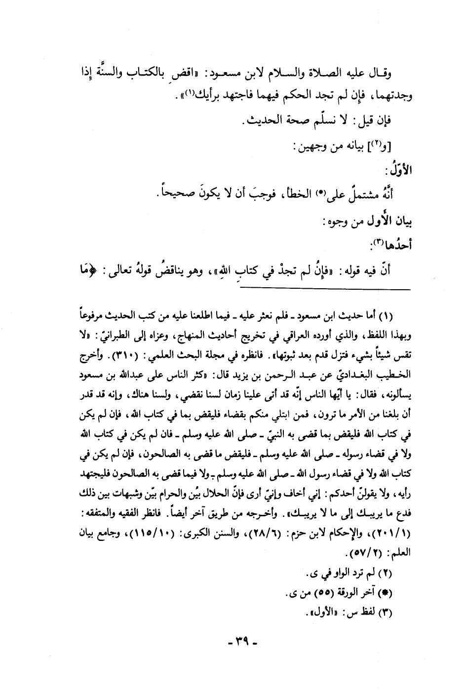 وقال عليه الصلاة والسلام لأبن مسعود اقض بالكتاب والسنة إذا وجدتهما فإن لم تجد الحكم فيهما فأجتهد برأيك فإن قيل لا نسلم صحة الحديث وبيانه من وجهين الأول أنه مشتمل على الخطأ فوجب أن لا يكون صحيحا بيان الأول من وجوه أحدها أن فيه قوله فإن لم تجد في كتاب الله وهو يناقض قوله تعالى ما