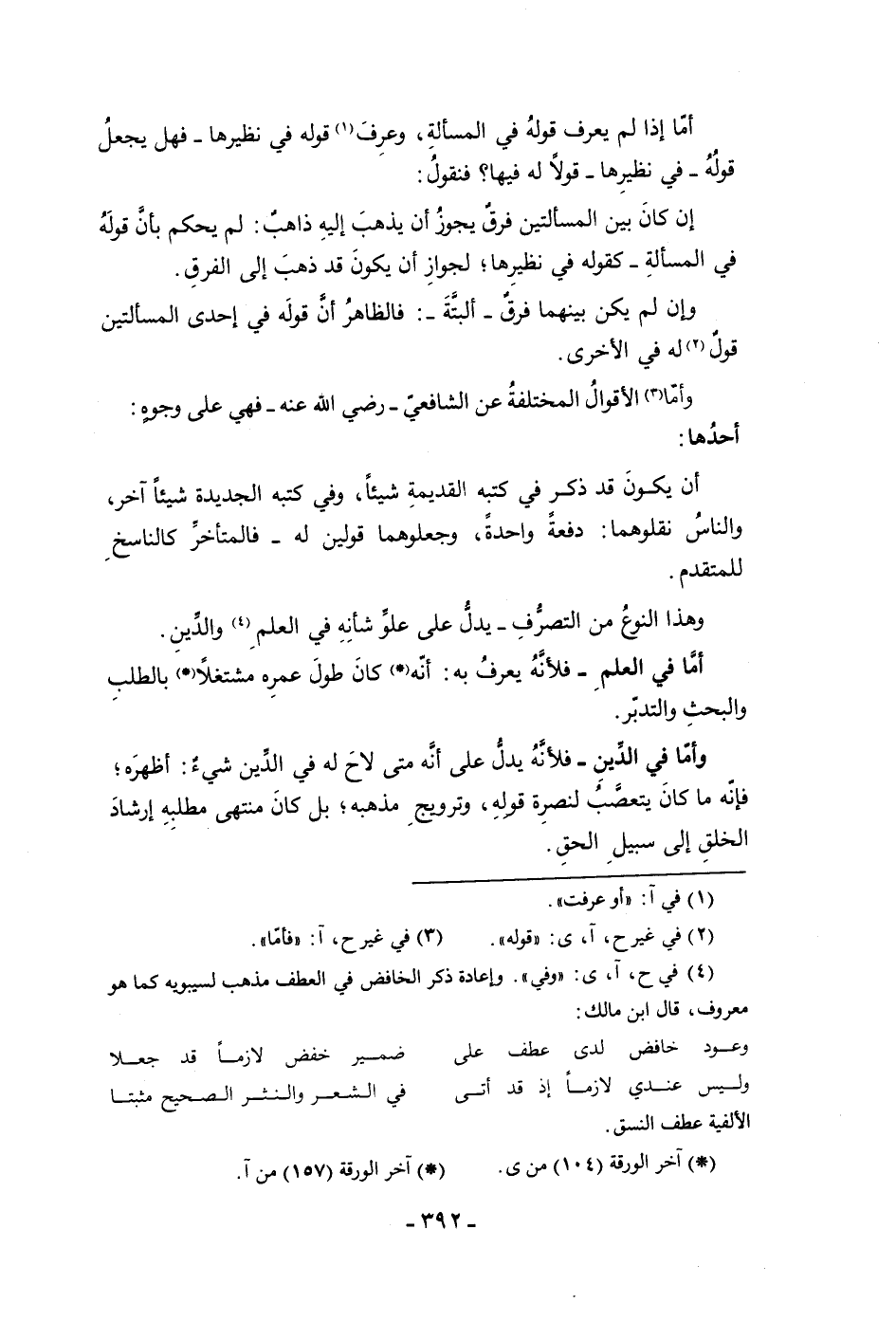 أما إذا لم يعرف قوله في المسألة وعرف قوله في نظيرها فهل يجعل قوله في نظيرها قولا له فيها فنقول إن كان بين المسألتين فرق يجوز أن يذهب إليه ذاهب لم يحكم بأن قوله في المسألة كقوله في نظيرها لجواز أن يكون قد ذهب إلى الفرق وإن لم يكن بينهما فرق ألبتة فالظاهر أن قوله في إحدى المسألتين قول له في الأخرى وأما الأقوال المختلفة عن الشافعي رضي الله عنه فهي على وجوه أحدها أن يكون قد ذكر في كتبه القديمة شيئا وفي كتبه الجديدة شيئا آخر والناس نقلوهما عليه دفعة واحدة وجعلوهما قولين له فالمتأخر كالناسخ