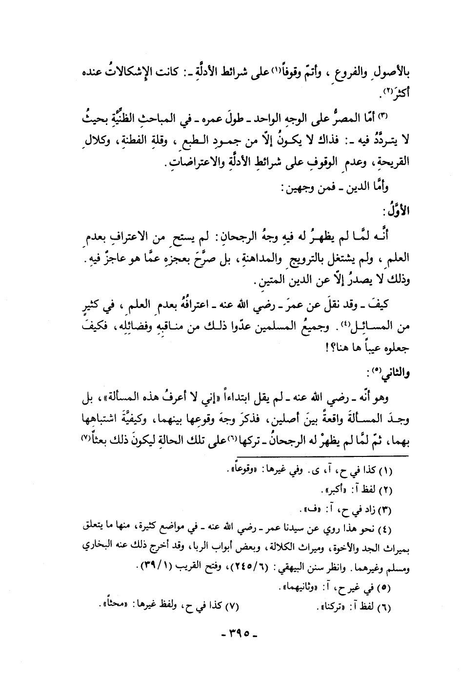 بالأصول والفروع وأتم وقوفا على شرائط الأدلة كانت الإشكالات عنده أكثر أما المصر على الوجه الواحد طول عمره في المباحث الظنية بحيث لا يتردد فيه فذاك لا يكون إلا من جمود الطبع وقلة الفطنة وكلال القريحة وعدم الوقوف على شرائط الأدلة والاعتراضات وأما الدين فمن وجهين الأول أنه لما لم يظهر له فيه وجه الرجحان لم يستح من الاعتراف بعدم العلم ولم يشتغل بالترويج (والمداهنة بل صرح بعجزه عما هو عاجز فيه وذلك لا يصدر إلا عن الدين المتين كيف وقد نقل عن عمر رضي الله عنه اعترافه بعدم العلم في كثير من المسائل وجميع المسلمين عدوا ذلك من مناقبه وفضائله فكيف جعلوه عيبا هاهنا والثاني وهو أنه رضي الله عنه لم يقل ابتداءا إنى لا اعرف هذه المسألة بل وجد المسألة واقعة بين أصلين فذكر وجه وقوعها بينهما وكيفية اشتباهها بهما ثم طا لم يظهر له الرجحان تركها على تلك الحالة ليكون ذلك بعثا