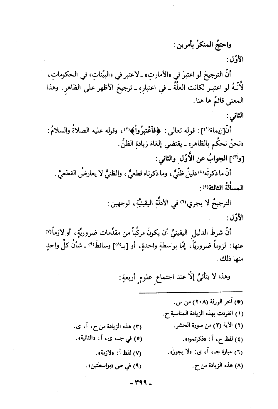 واحتج المنكر بأمرين الأول أن الترجيح لو اعتبر من الأمارات لاعتبر في البينات في الحكومات لأنه لو اعتبر لكانت العلة في اعتباره ترجيح الأظهر على الظاهر وهذا المعنى قائم هاهنا الثاني أن إيماء قوله تعالى فاعتبروا وقوله عليه الصلاة والسلام نحن نحكم بالظاهر يقتضي إلغاء زيادة الظن والجواب عن الأول والثاني