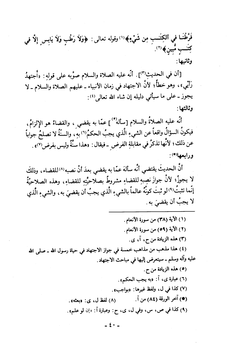 فرطنا في الكتاب من شئ وقوله تعالى ولا رطب ولا يابس إلا في كتاب مبين) وثانيها أن في الحديث أنه عليه الصلاة والسلام صوبه على قوله أجتهد رأيي وهو خطأ لأن الاجتهاد في زمان الأنبياء عليهم الصلاة والسلام لا يجوز على ما سيأتي دليله إن شاء الله تعالى وثالثها أنه عليه الصلاة والسلام سأله عما به يقضى والقضاء هو الإلزام