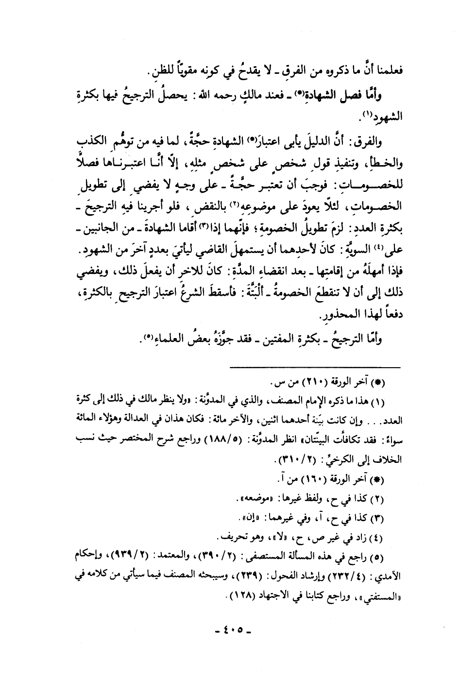 فعلمنا أن ما ذكروه من الفرق لا يقدح في كونه مقويا للظن وأما فصل الشهادة فعند مالك رحمه الله يحصل الترجيح فيها بكثرة الشهود والفرق أن الدليل يأبى اعتبار الشهادة حجة لما فيه من توهم الكذب والخطأ وتنفيذ قول شخص على شخص مثله إلا أنا اعتبرناها فصلا للخصومات فوجب أن تعتبر حجة على وجه لا يفضى إلى تطويل الخصومات لئلا يعود على موضوعه بالنقض فلو أجرينا فيه الترجيح