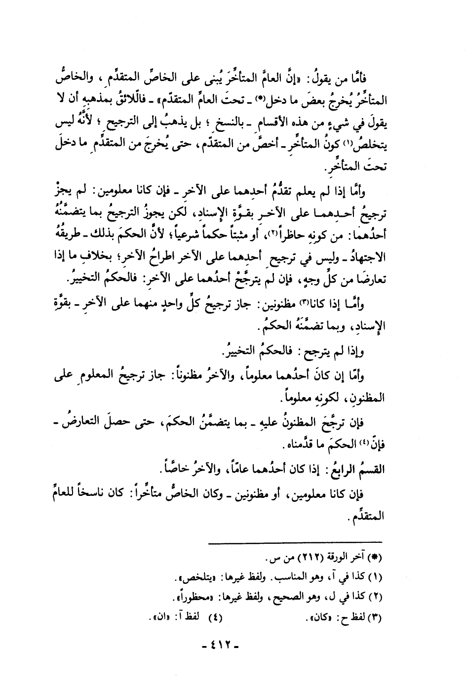 فأما من يقول أن العام المتأخر يبنى على الخاص المتقدم والخاص المتأخر يخرج بعض ما دخل تحت العام المتقدم فاللائق بمذهبه أن لا يقول في شئ من هذا لأقسام بالنسخ بل يذهب إلى الترجيح لأنه ليس يتخلص كون المتأخر أخص من المتقدم حتى يخرج من المتقدم ما دخل تحت المتأخر وإما اذا لم يعلم تقدم أحدهما على الآخر فإن كانا معلومين لم يجز ترجيح أحدهما على الآخر بقوة الإسناد لكن يجوز الترجيح بما يتضمنه أحدهما من كونه حاظرا أو مثبتا حكما شرعيا لأن الحكم بذلك طريقة الاجتهاد وليس في ترجيح أحدهما على الآخر اطراح الآخر بخلاف ما إذا تعارضا من كل وجه فإن لم يترجح أحدهما على الآخر فالحكم التخيير وأما إذا كانا مظنونين جاز ترجيح كل واحد منهما على الآخر بقوة الإسناد وبما تضمنه الحكم وإذا لم يترجح فالحكم التخيير وأما إن كان أحدهما معلوما والآخر مظنونا جاز ترجيح المعلوم على المظنون لكونه معلوما فإن ترجح المظنون عليه بما يتضمن الحكم حتى حصل التعارض فإن الحكم ما قدمناه القسم الرابع إذا كان أحدهما عاما والآخر خاصا فإن كانا معلومين أو مظنونين وكان الخاص متأخرا كان ناسخا للعام المتقدم