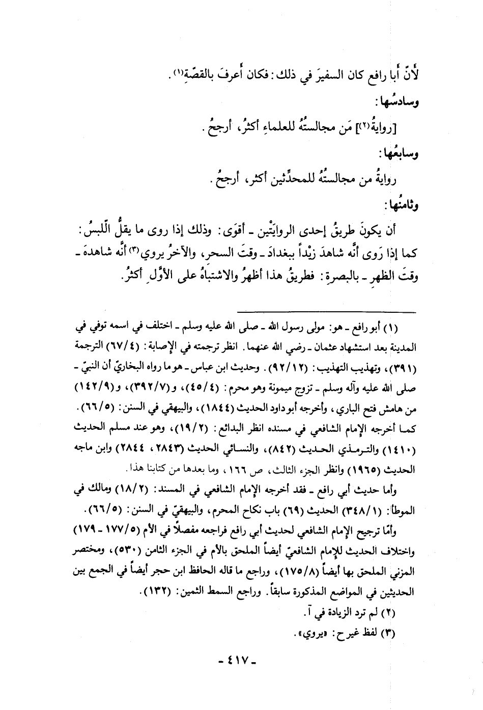 رواية من مجالسته للعلماء أكثر أرجح وسابعها رواية من مجالسته للمحدثين أكثر أرجح وثامنها أن يكون طريق إحدى الروايتين أقوى وذلك إذا روى ما يقل اللبس كما إذا روى أنه شاهد زيدا ببغداد وقت السحر والآخر يروى أنه شاهده وقت الظهر بالبصرة فطريق هذا أظهر والاشتباه على الأول أكثر