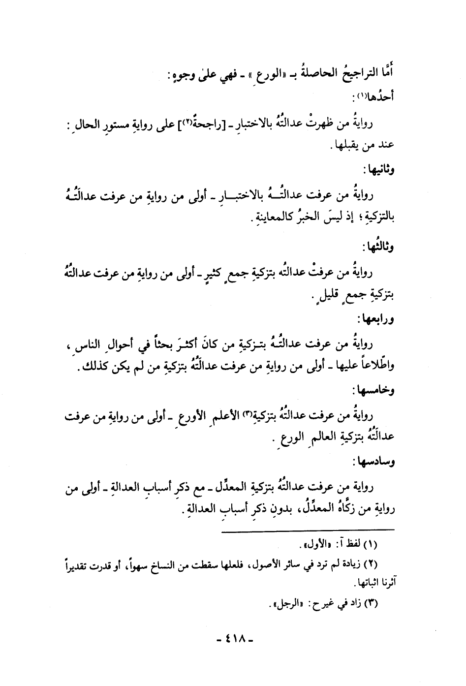 أما التراجيح الحاصلة بالورع فهى على وجوه أحدها رواية من ظهرت عدالته بالاختبار راجحة على رواية مستور الحال عند من يقبلها وثانيها رواية من عرفت عدالته بالاختبار أولى من رواية من عرفت عدالته بالتزكية إذ ليس الخبر كالمعاينة وثالثها رواية من عرفت عدالته بتزكية جمع كثير أولى من رواية من عرفت عدالته بتزكية جمع قليل ورابعها رواية من عرفت عدالته بتزكية من كان أكثر بحثا في أحوال الناس واطلاعا عليها أولى من رواية من عرفت عدالته بتزكية من لم يكن كذلك وخامسها