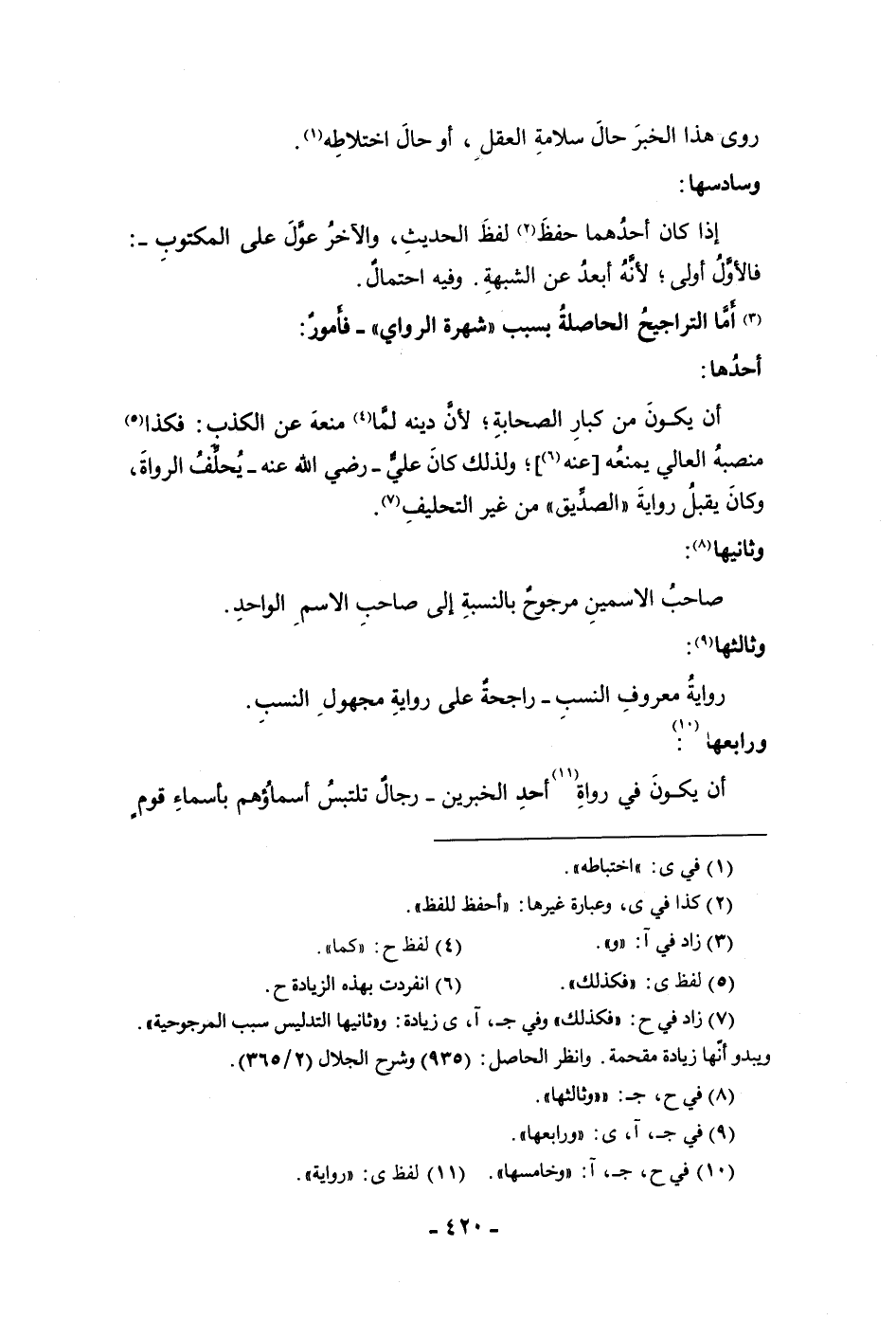روى هذا الخبر حال سلامة العقل أو حال اختلاطه وسادسها إذا كان أحدهما حفظ لفظ الحديث والآخر عول على المكتوب فالأول أولى لأنه أبعد عن الشبهة وفيه احتمال أما التراجيح الحاصلة بسبب شهرة الراوى فأمور أحدها أن يكون من كبار الصحابة لأن دينه لما منعه عن الكذب فكذا منصبه العالى يمنعه عنه ولذلك كان علي رضي الله عنه يحلف الرواة وكان يقبل رواية الصديق من غير التحليف وثانيها صاحب الاسمين مرجوح بالنسبة إلى صاحب الاسم الواحد وثالثها رواية معروف النسب راجحة على رواية مجهول النسب ورابعها أن يكون في رواة أحد الخبرين رجال تلتبس أسماؤهم بأسماء قوم