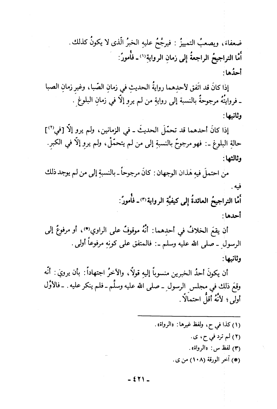 ضعفاء ويصعب التمييز فيرجح عليه الخبر الذي لا يكون كذلك أما التراجيح الراجعة إلى زمان الرواية فأمور أحدها إذا كان قد اتفق لأحدهما رواية الحديث في زمان الصبا وغير زمان الصبا فروايته مرجوحة بالنسبة إلى رواية من لم يرو الا في زمان البلوغ وثانيها إذا كان أحدهما قد تحمل الحديث في الزمانين ولم يرو إلا في حالة البلوغ فهو مرجوح بالنسبة إلى من لم يتحمل ولم يرو إلا في الكبر وثالثها من احتمل فيه هذان الوجهان كان مرجوحا بالنسبة إلى من لم يوجد ذلك فيه أما التراجيح العائدة إلى كيفية الرواية فأمور أحدها أن يقع الخلاف في أحدهما أنه موقوف على الراوى أو مرفوع إلى الرسول ص فالمتفق على كونه مرفوعا أولى وثانيها أن يكون أحد الخبرين منسوبا إليه قولا والآخر اجتهادا بأن يروى أنه وقع ذلك في مجلس الرسول ص فلم ينكر عليه فالأول أولى لأنه أقل احتمالا
