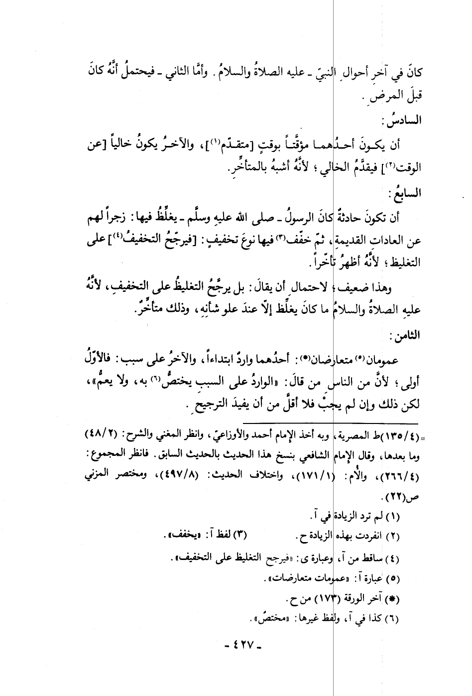 كان في آخر أحوال النبي عليه الصلاة والسلام وأما الثاني فيحتمل انه كان قبل المرض السادس أن يكون أحدهما مؤقتا بموقت متقدم والآخر يكون خاليا عن الوقت فيقدم الخالى لأنه أشبه بالمتأخر السابع أن تكون حادثة كان الرسول ص يغلظ بها زجرا لهم عن العادات القديمة ثم خفف فيها نوع تخفيف فيرجح التخفيف على التغليظ لأنه أظهر تأخرا وهذا ضعيف لاحتمال أن يقال بل يرجح التغليظ على التخفيف لأنه عليه الصلاة والسلام ما كان يغلظ إلا عند علو شأنه وذلك متأخر الثامن عمومان متعارضان أحدهما واردا ابتداءا والآخر على سبب فالأول أولى لأن من الناس من قال الوارد على السبب يختص به ولا يعم لكن ذلك وإن لم يجب فلا أقل من أن يفيد الترجيح