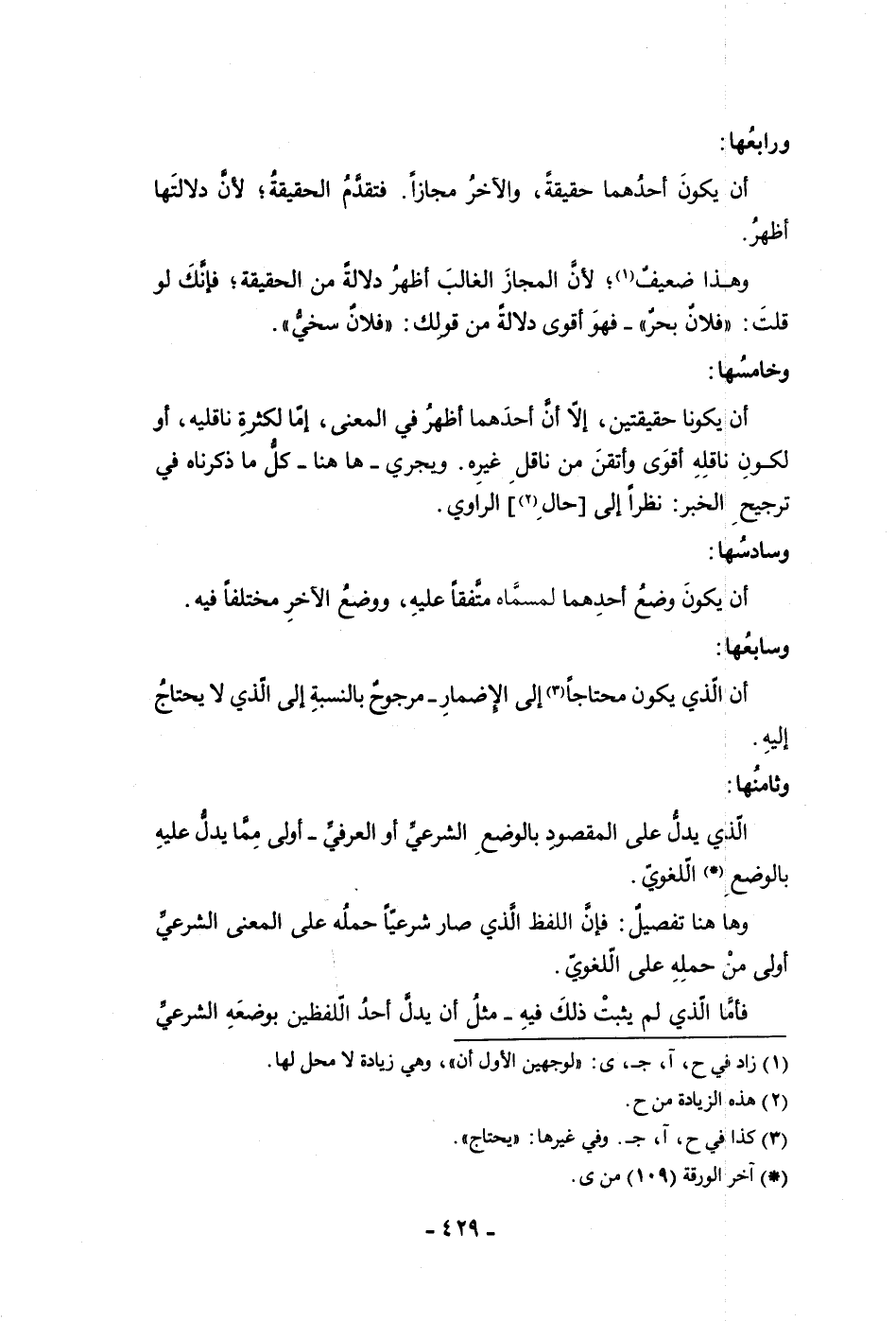 ورابعها أن يكون أحدهما حقيقة والآخر مجازا فتقدم الحقيقة لأن دلالتها أظهر وهذا ضعيف لأن المجاز الغالب أظهر دلالة من الحقيقة فإنك لو قلت فلان بحر فهو أقوى دلالة على قولك فلان سخى وخامسها أن يكونا حقيقتين إلا أن أحدهما أظهر في المعنى إما لكثرة ناقليه أو لكون ناقله أقوى وأتقن من ناقل غيره ويجرى هاهنا كل ما ذكرناه في