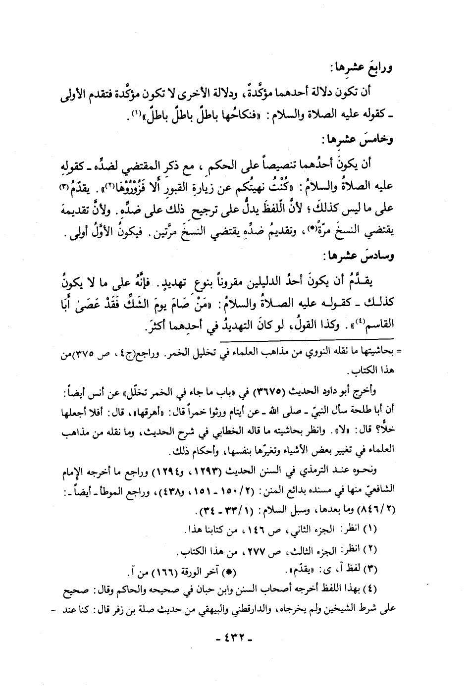 ورابع عشرها أن تكون دلالة أحدهما مؤكدة ودلالة الأخرى لا تكون مؤكدة فتقدم الأولى كقوله عليه الصلاة والسلام فنكاحها باطل باطل باطل وخامس عشرها أن يكون أحدهما تنصيصا على الحكم مع ذكر المقتضي لضده كقوله عليه الصلاة والسلام كنت نهيتكم عن زيارة القبور ألا فزوروها يقدم على ما ليس كذلك لأن اللفظ يدل على ترجيح ذلك على ضده ولأن تقديمه يقتضى النسخ مرة وتقديم ضده يقتضى النسخ مرتين فيكون الأول أولى وسادس عشرها يقدم أن يكون أحد الدليلين مقرونا بنوع تهديد فإنه على ما لا يكون كذلك كقوله عليه الصلاة والسلام من صام يوم الشك فقد عصى أبا القاسم وكذا القول لو كان التهديد في أحدهما أكثر