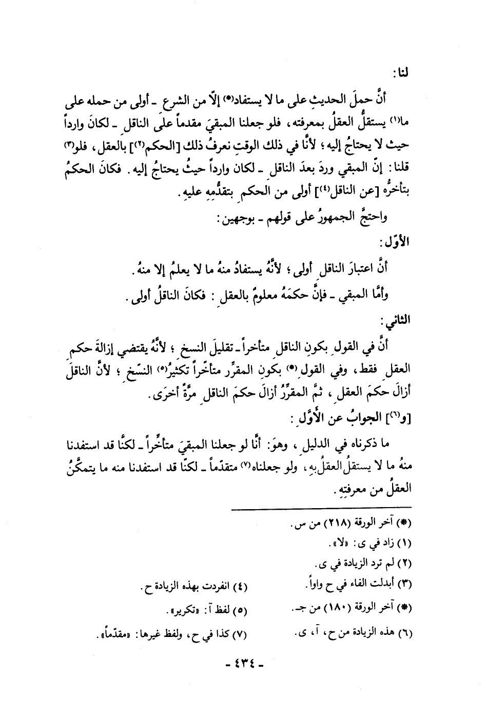 لنا أن حمل الحديث على ما لا يستفاد الا من الشرع أولى من حمله على ما يستقل العقل بمعرفته فلو جعلنا المبقي مقدما على الناقل لكان واردا حيث لا يحتاج إليه لأنا في ذلك الوقت نعرف ذلك الحكم بالعقل فلو قلنا إن المبقى ورد بعد الناقل لكان واردا حيث يحتاج إليه فكان الحكم بتأخره عن الناقل أولى من الحكم بتقدمه عليه وأحتج الجمهور على قولهم بوجهين الأول أن اعتبار الناقل أولى لأنه يستفاد منه ما لا يعلم إلا منه وأما المبقى فإن حكمه معلوم بالعقل فكان الناقل أولى الثاني أن في القول بكون الناقل متأخرا تقليل النسخ لأنه يقتضى إزالة حكم العقل فقط وفي القول يكون المقرر متأخرا تكثير النسخ لأن الناقل