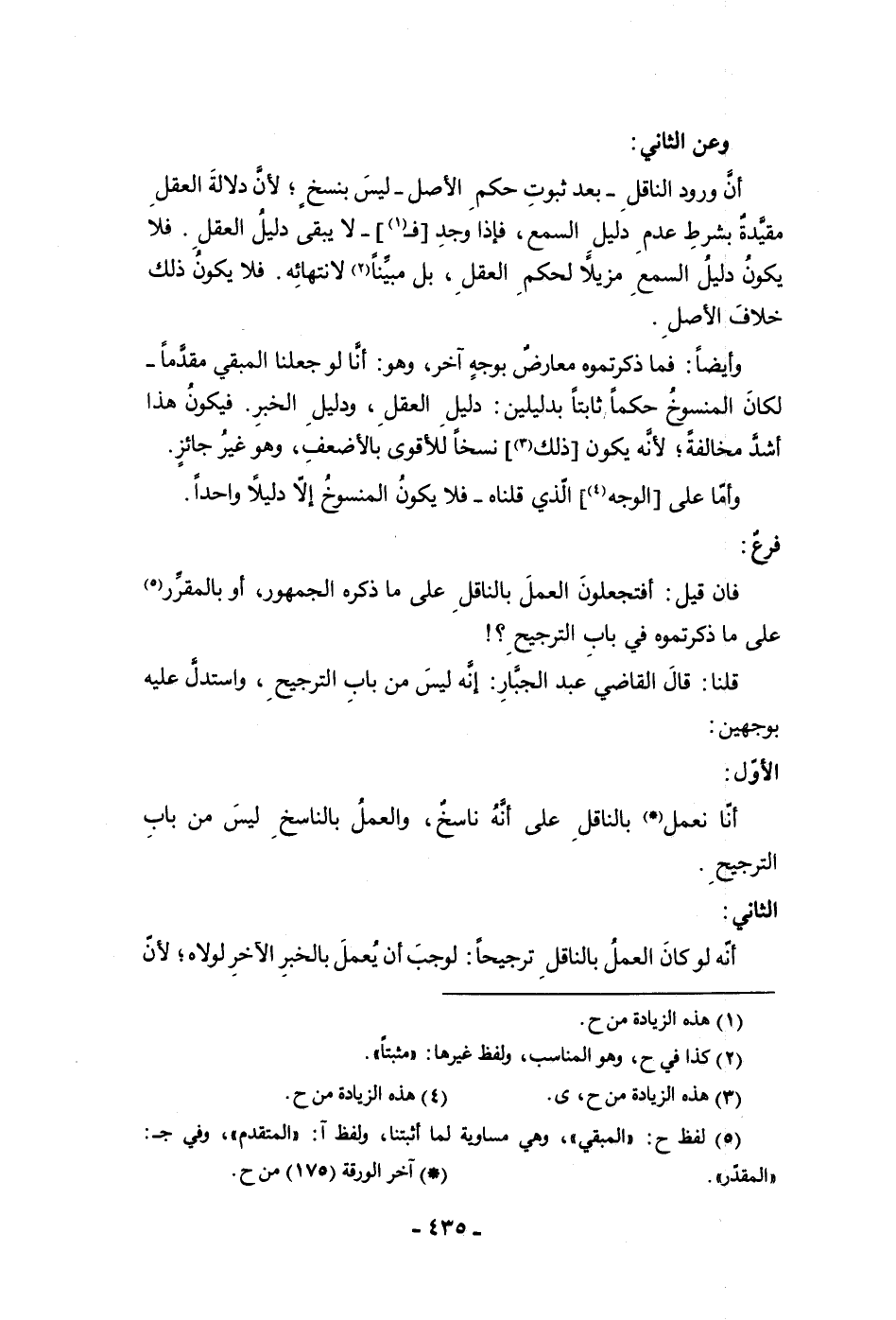 وعن الثاني أن ورود الناقل بعد ثبوت حكم الأصل ليس بنسخ لأن دلالة العقل مقيدة بشرط عدم دليل السمع فإذا وجد فلا يبقى دليل العقل فلا يكون دليل السمع مزيلا لحكم العقل بل مبينا لانتهائه فلا يكون ذلك خلاف الأصل وأيضا فما ذكرتموه معارض بوجه آخر وهو أنا لو جعلنا المبقى مقدما لكان المنسوخ حكما ثابتا بدليلين دليل العقل ودليل الخبر فيكون هذا أشد مخالفة لأنه يكون ذلك نسخا للأقوى بالأضعف وهو غير جائز وأما على الوجه الذي قلناه فلا يكون المنسوخ إلا دليلا واحدا فرع فان قيل أفتجعلون العمل بالناقل على ما ذكره الجمهور أو بالمقرر على ما ذكرتموه في باب الترجيح قلنا قال القاضي عبد الجبار أنه ليس من باب الترجيح واستدل عليه بوجهين الأول أنا نعمل بالناقل على أنه ناسخ والعمل بالناسخ ليس من باب