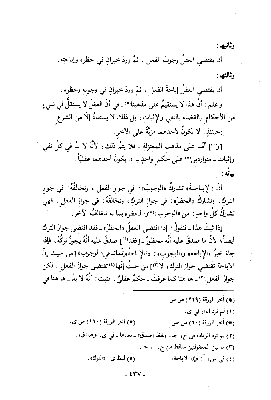 أن يقتضى العقل وجوب الفعل ثم ورد خبران في حظره وإباحته وثالثها أن يقتضى العقل إباحة الفعل ثم ورد خبران في وجوبه وحظره واعلم أن هذا لا يستقيم على مذهبنا في أن العقل لا يستقل في شئ من الأحكام بالقضاء والنفى بالإثبات بل ذلك لا يستفاد إلا من الشرع وحينئذ لا يكون لأحدهما مزية على الآخر وأما على مذهب المعتزلة فلا يتم ذلك لأنه لا بد في كل نفى وإثبات متواردين على حكم واحد أن يكون أحدهما عقليا بيانه أن الإباحة تشارك الوجوب في جواز الفعل وتخالفه في جواز الترك وتشارك الحظر في جواز الترك وتخالفه في جواز الفعل فهى تشارك كل واحد من الوجوب والحظر بما به تخالف الآخر إذا ثبت هذا فنقول إذا اقتضى العقل الحظر فقد اقتضى جواز الترك أيضا لأن ما صدق عليه أنه محظور فقد صدق عليه أنه يجوز تركه فإذا جاء خبر الإباحة والوجوب فالإباحة إنما تنافي الوجوب من حيث إن الإباحة تقتضى جواز الترك لا من حيث إنها تقتضى جواز الفعل لكن جواز الفعل هاهنا كما عرفت حكم عقلى فثبت أنه لا بد هاهنا في