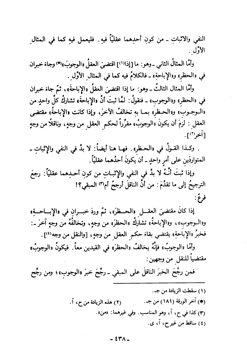 وأما المثال الثالث وهو ما إذا اقتضى العقل والإباحة ثم في جاء خبرأن في الحضر والوجوب فنقول لما ثبت أن الإباحة تشارك كل واحد من الوجوب والحظر بما به تخالف الآخر وإذا كانت الإباحة مقتضى العقل لزم أن يكون الوجوب مقررا لحكم العقل من وجه وناقلا من وجه آخر وكذا القول في الحظر فهاهنا أيضا لابد في النفى والإثبات المتواردين بن على أمر واحد أن يكون أحدهما عقليا وإذا ثبت أنه لا بد في النفي والإثبات من كون أحدهما عقليا رجع الترجيح إلى ما تقدم من أن الناقل أرجح أم المبقى فرع إذا كان مقتضى العقل الحظر ثم ورد خبران في الإباحة والوجوب والإباحة تشارك الحظر من وجه وتخالفه من وجه آخر فخبر الإباحة يقتضى بقاء حكم العقل من وجه والنقل من وجه وأما الوجوب فإنه يخالف الحظر في القيدين معا فيكون الوجوب مقتضيا للنقل من وجهين فمن رجح الخبر الناقل على المبقى رجح خبر الوجوب ومن رجح