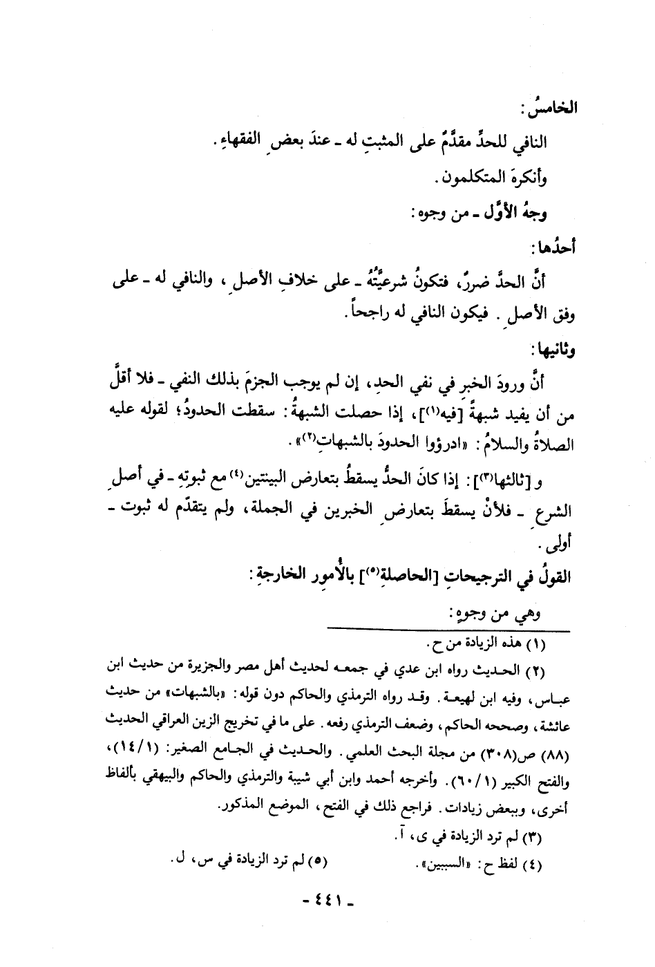 الخامس النافي للحد مقدم على المثبت له عند بعض الفقهاء وأنكره المتكلمون وجه الأول من وجوه أحدها أن الحد ضرر فتكون شرعيته على خلاف الأصل والنافي له على وفق الأصل فيكون النافي له راجحا وثانيها أن ورود الخبر في نفى الحد إن لم يوجب الجزم بذلك النفى فلا أقل من أن يفيد شبهة فيه إذا حصلت الشبهة سقطت الحدود لقوله عليه الصلاة والسلام ادرؤا الحدود بالشبهات وثالثها إذا كان الحد يسقط بتعارض البينتين مع ثبوته في أصل الشرع فلأن يسقط بتعارض الخبرين في الجملة ولم يتقدم له ثبوت