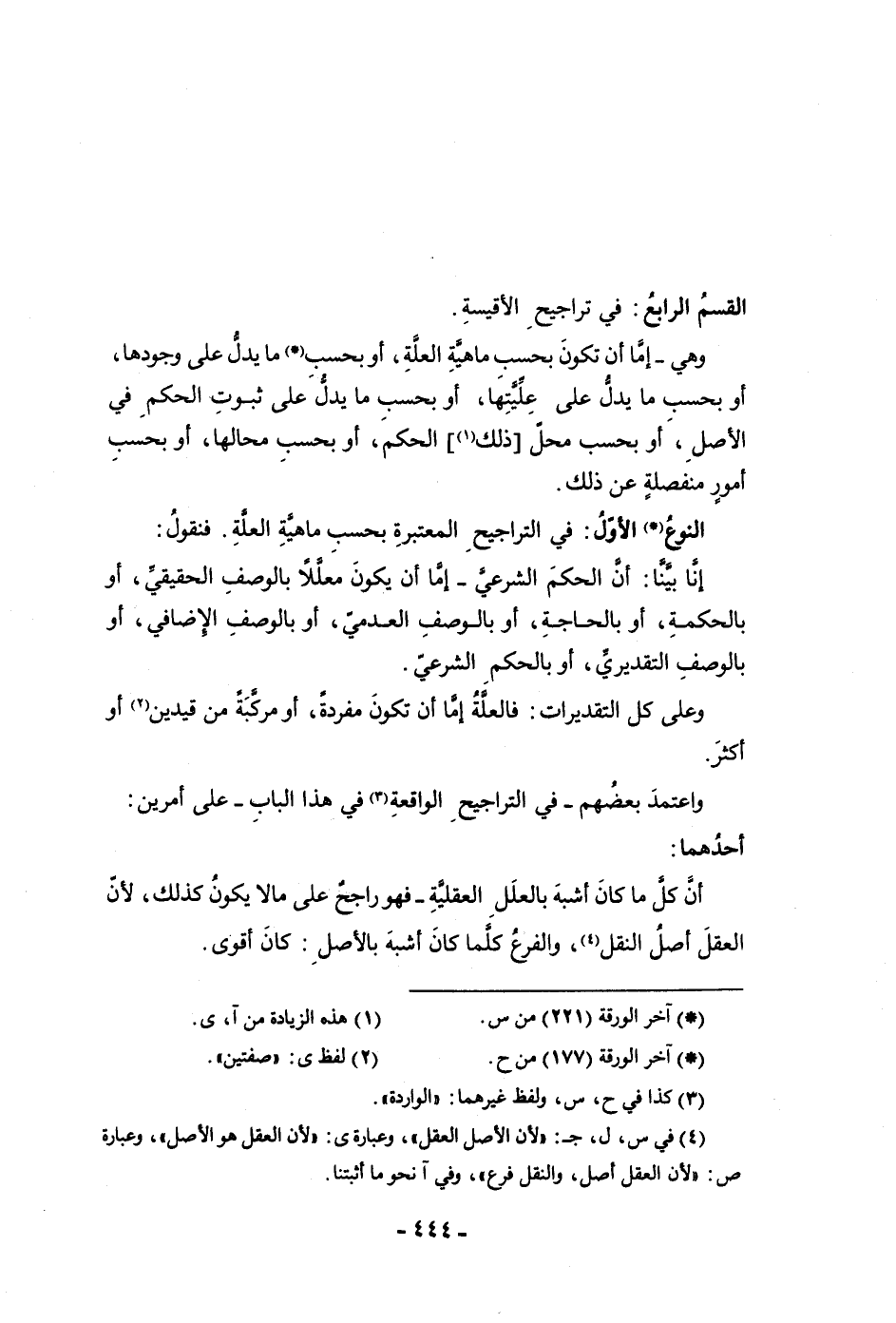 القسم الرابع في تراجيح سنة الأقيسة وهي إما أن تكون بحسب ماهية العلة أو بحسب ما يدل على وجودها أو بحسب ما يدل على عليتها أو بحسب ما يدل على ثبوت الحكم في الأصل أو بحسب محل ذلك الحكم أو بحسب محالها أو بحسب أمور منفصلة عن ذلك النوع الأول في التراجيح المعتبرة بحسب ماهية العلة فنقول إنا بينا أن الحكم الشرعي إما أن يكون معللا بالوصف الحقيقي أو بالحكمة أو بالحاجة أو بالوصف العدمي أو بالوصف الإضافي أو بالوصف التقديرى أو بالحكم الشرعي وعلى كل التقديرات فالعلة إما أن تكون مفردة أو مركبة من قيدين أو أكثر واعتمد بعضهم في التراجيح الواقعة في هذا الباب على أمرين أحدهما أن كل ما كان أشبه بالعلل العقلية فهو راجح على ما لا يكون كذلك لأن