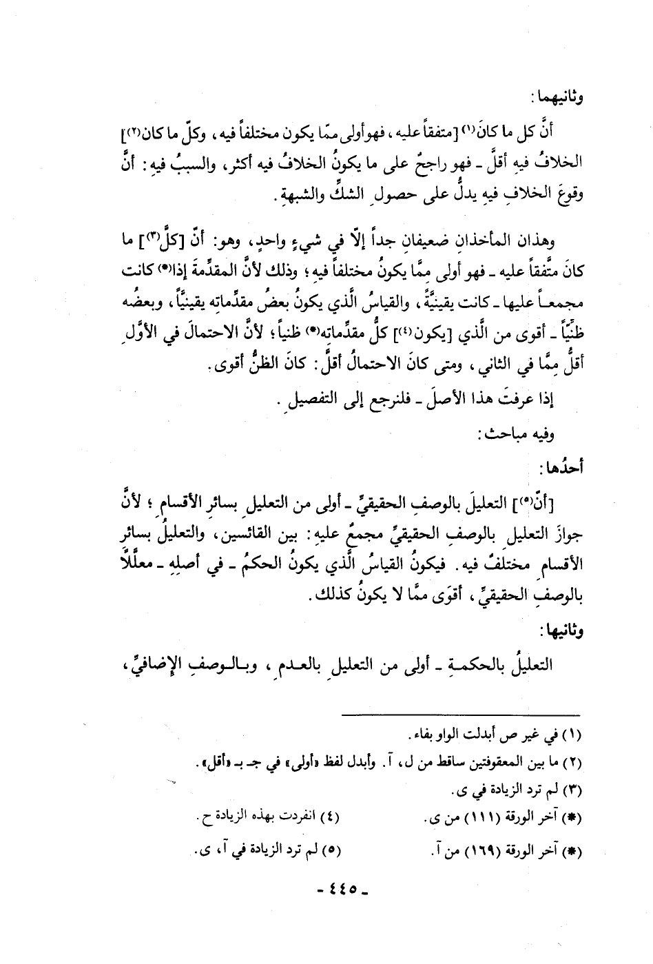 وثانيها أن كل ما كان متفقا عليه فهو أولى مما يكون مختلفا فيه وكل ما كان الخلاف فيه أقل فهو راجح على ما يكون الخلاف فيه أكثر والسبب فيه أن وقوع الخلاف فيه يدل على حصول الشك والشبهة وهذان المأخذان ضعيفان جدا إلا في شئ واحد وهو أن كل ما كان متفقا عليه فهو أولى مما يكون مختلفا فيه وذلك لأن المقدمة إذا كانت مجمعا عليها كانت يقينية والقياس الذي يكون بعض مقدماته يقينيا وبعضه ظنيا أقوى من الذي يكون كل مقدماته ظنيا لأن الاحتمال في الأول أقل مما في الثاني ومتى كان الاحتمال أقل كان الظن أقوى إذا عرفت هذا الأصل فلنرجع إلى التفصيل وفيه مباحث أحدها أن التعليل بالوصف الحقيقي أولى من التعليل بسائر الأقسام لأن جواز التعليل بالوصف الحقيقي مجمع عليه بين القائسين والتعليل بسائر الأقسام مختلف فيه فيكون القياس الذي يكون الحكم في أصله معللا بالوصف الحقيى أقوى مما لا يكون كذلك وثانيها التعليل بالحكمة أولى من التعليل بالعدم وبالوصف الإضافي