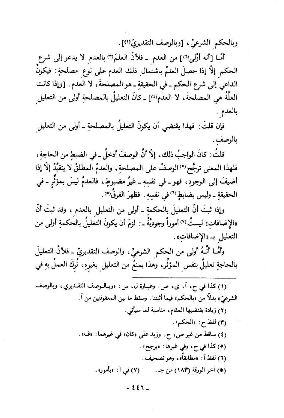 أما أنه أولى من العدم فلأن العلم بالعدم لا يدعو إلى شرع الحكم إلا إذا حصل العلم بإشتمال ذلك العدم على نوع مصلحة فيكون الداعى إلى شرع الحكم في الحقيقة هو المصلحة لا العدم وإذا كانت العلة هى المصلحة لا العدم كان التعليل بالمصلحة أولى من التعليل بالعدم فإن قلت فهذا يقتضي أن يكون التعليل بالمصلحة أولى من التعليل بالوصف قلت كان الواجب ذلك إلا أن الوصف أدخل في الضبط من الحاجة فلهذا المعنى ترجح الوصف على المصلحة والعدم المطلق لا يتقيد إلا إذا أضيف إلى الوجود فهو في نفسه غير مضبوط فالعدم ليس بمؤثر في الحقيقة وليس بضابط في نفسه فظهر الفرق وإذا ثبت أن التعليل بالحكمة أولى من التعليل بالعدم وقد ثبت أن الإضافات ليست أمورا وجودية لزم أن يكون التعليل بالحكمة أولى من التعليل بالإضافات وأما أنه أولى من الحكم بالشرع والوصف التقديرى فلأن التعليل بالحاجة تعليل بنفس المؤثر وهذا يمنع من التعليل بغيره ترك العمل به في