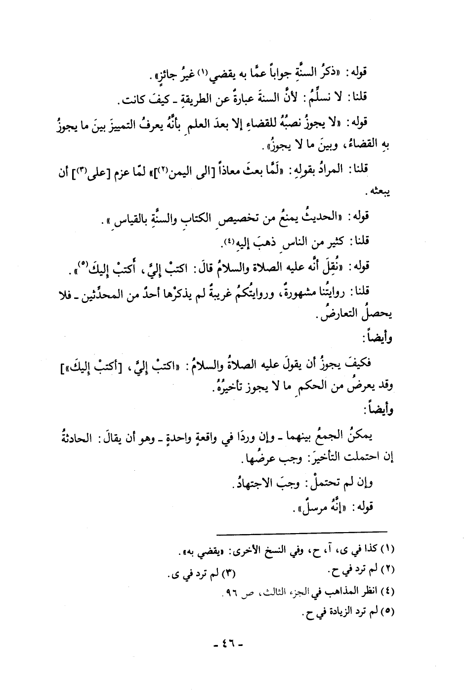 قوله ذكر السنة جوابا عما به يقضى غير جائز قلنا لا نسلم لأن السنة عبارة عن الطريقة كيف كانت قوله لا يجوز نصبه للقضاء إلا بعد العلم بأنه يعرف التمييز بين ما يجوز به القضاء وبين ما لا يجوز قلنا المراد بقوله لما بعث معاذا إلى اليمن لما عزم على أن يبعثه قوله الحديث يمنع من تخصيص الكتاب والسنة بالقياس قلنا كثير من الناس ذهب إليه قوله نقل أنه عليه الصلاة والسلام قال اكتب إلي أكتب إليك قلنا روايتنا مشهورة وروايتكم غريبة لم يذكرها أحد من المحدثين فلا يحصل التعارض وأيضا فكيف يجوز أن يقول عليه الصلاة والسلام اكتب إلي أكتب إليك وقد يعرض من الحكم مالا يجوز تأخيره وأيضا يمكن الجمع بينهما وإن وردا في واقعة واحدة وهو أن يقال الحادثة إن احتملت التأخير وجب عرضها