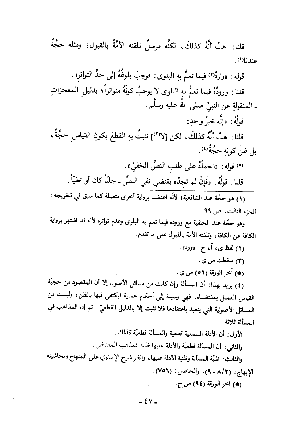 قلنا هب أنه كذلك لكنه مرسل تلقته الأمة بالقبول ومثله حجة عندنا قوله وارد فيما تعم به البلوى فوجب بلوغه إلى حد التواتر قلنا وروده فيما تعم به البلوى لا يوجب كونه متواترا بدليل المعجزات المنقولة عن النبي ص قوله إنه خبر واحد قلنا هب أنه كذلك لكن لا نثبت به القطع بكون القياس حجة بل ظن كونه حجة قوله نحمله على طلب النص الخفى قلنا قوله فإن لم تجد يقتضى نفي النص جليا كان أو خفيا