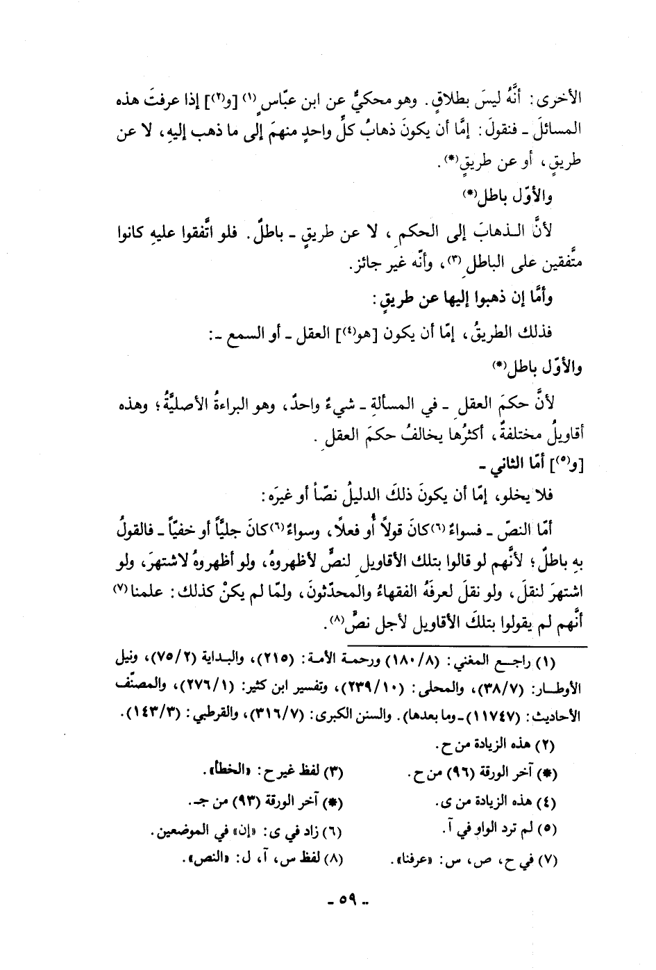 الأخرى أنه ليس بطلاق وهو محكى عن ابن عباس وإذا عرفت هذه المسائل فنقول إما أن يكون ذهاب كل واحد منهم إلى ما ذهب إليه لا عن طريق أو عن طريق والأول باطل لأن الذهاب إلى الحكم لا عن طريق باطل فلو اتفقوا عليه كانوا متفقين على الباطل وإنه غير جائز وأما إن ذهبوا إليها عن طريق فذلك الطريق إما أن يكون هو العقل أو السمع والأول باطل لأن حكم العقل في المسألة شئ واحد وهو البراءة الأصلية وهذه أقاويل مختلفة أكثرها يخالف حكم العقل وأما الثاني فلا يخلو إما أن يكون ذلك الدليل نصا أو غيره أما النص فسواء كان قولا أو فعلا وسواء كان جليا أو خفيا فالقول به باطل لأنهم لو قالوا بتلك الأقاويل لنص لأظهروه ولو أظهروه لاشتهر ولو اشتهر لنقل ولو نقل لعرفه الفقهاء والمحدثون ولما لم يكن كذلك علمنا أنهم لم يقولوا بتلك الأقاويل لأجل نص