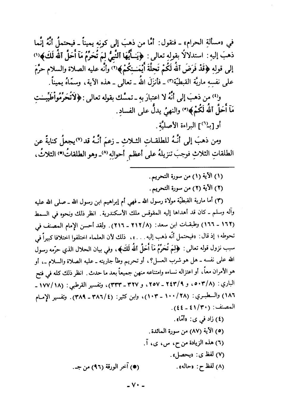 في مسألة الحرام فنقول أما من ذهب إلى كونه يمينا فيحتمل أنه إنما ذهب إليه استدلالا بقوله تعالى يا أيها النبي لم تحرم ما أحل الله لك إلى قوله قد فرض الله لكم تحلة أيمانكم وانه عليه الصلاة والسلام حرم على نفسه مارية القبطية فأنزل الله تعالى هذه الآية وسماه يمينا ومن ذهب إلى أنه لا اعتبار به تمسك بقوله تعالى لا تحرموا طيبات ما أحل لكم والنهي يدل على الفساد أو بالبراءة الأصلية ومن ذهب إلى أنه للطلقات حديث الثلاث زعم أنه قد يجعل كناية عن الطلقات الثلاث فوجب تنزيله على أعظم أحواله وهو الطلقات الثلاث