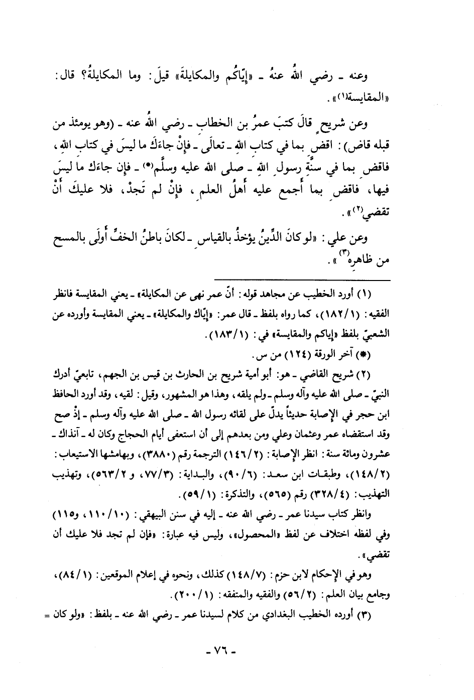 وعنه رضى الله عنه إياكم والمكايلة قيل وما المكايلة قال المقايسة وعن شريح قال كتب عمر بن الخطاب رضي الله عنه وهو يومئذ من قبله قاض اقض بما في كتاب الله تعالى فإن جاءك ما ليس في كتاب الله فاقض بما في سنة رسول الله ص فإن جاءك ما ليس فيها فاقض بما أجمع عليه أهل العلم فإن لم تجد فلا عليك أن تقضي وعن على لو كان الدين يؤخذ بالقياس لكان باطن الخف أولى بالمسح من ظاهره