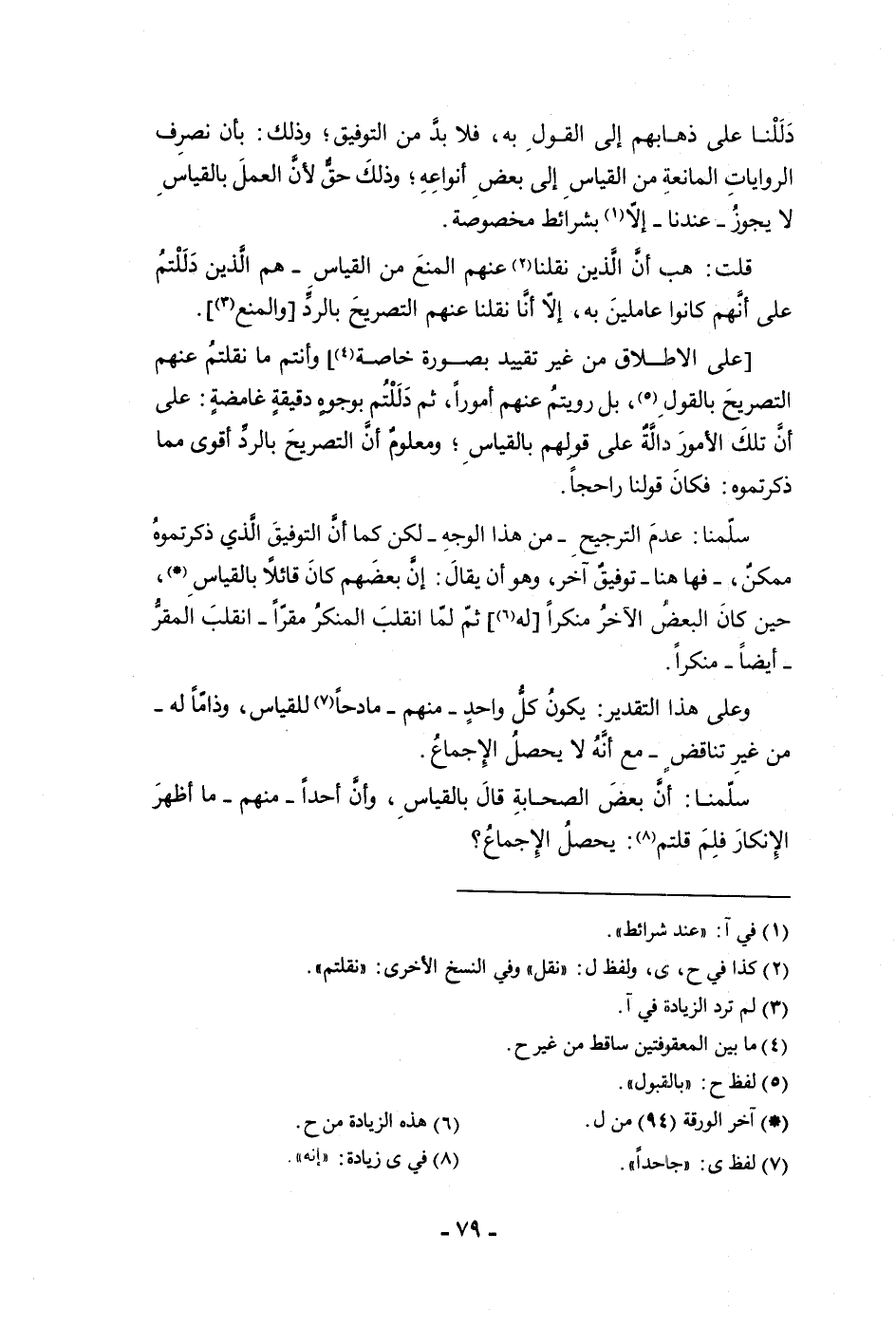 ممكن فهاهنا توفيق آخر وهو أن يقال إن بعضهم كان قائلا بالقياس حين كان البعض الآخر منكرا له ثم لما انقلب المنكر مقرا انقلب المقر أيضا منكرا وعلى هذا التقدير يكون كل واحد منهم مادحا للقياس وذاما له من غير تناقض مع أنه لا يحصل الإجماع سلمنا أن بعض الصحابة قال بالقياس وأن أحدا منهم ما أظهر الإنكار فلم قلتم يحصل الإجماع