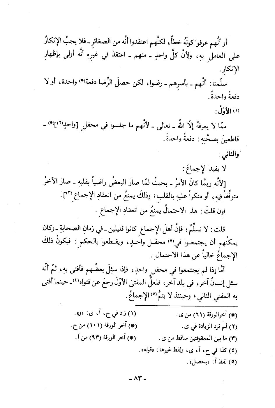 أو أنهم عرفوا كونه خطأ لكنهم اعتقدوا أنه من الصغائر فلا يجب الإنكار على العامل به ولأن كل واحد منهم اعتقد في غيره أنه أولى بإظهار الإنكار سلمنا أنهم بأسرهم رضوا لكن حصل الرضا دفعة واحدة أولا دفعة واحدة الأول مما لا يعرفه إلا الله تعالى لأنهم ما جلسوا في محفل واحد قاطعين بصحته دفعة واحدة والثاني لا يفيد الإجماع لأنه ربما كان الأمر بحيث لما صار البعض راضيا بقلبه صار الآخر متوقفا فيه أو منكرا عليه بالقلب وذلك يمنع من انعقاد الإجماع فإن قلت هذا الاحتمال يمنع من انعقاد الإجماع قلت لا نسلم فإن أهل الإجماع كانوا قليلين في زمان الصحابة وكان يمكنهم أن يجتمعوا في محفل واحد ويقطعوا بالحكم فيكون ذلك الإجماع خاليا عن هذا الاحتمال أما إذا لم يجتمعوا في محفل واحد فإذا سئل بعضهم فأفتى به ثم أنه سئل إنسان آخر في بلد آخر فلعل المفتى الأول رجع عن فتواه حينما أفتى به المفتى الثاني وحينئذ لا يتم الإجماع